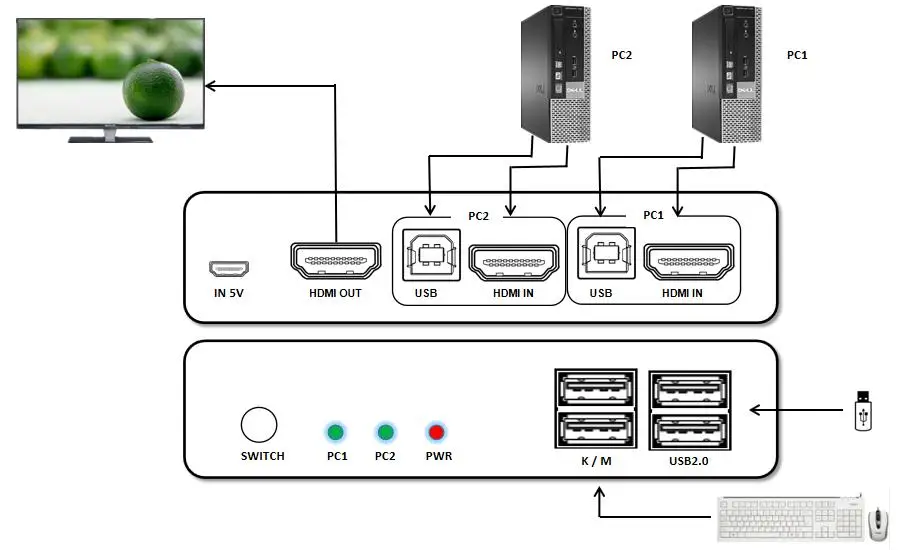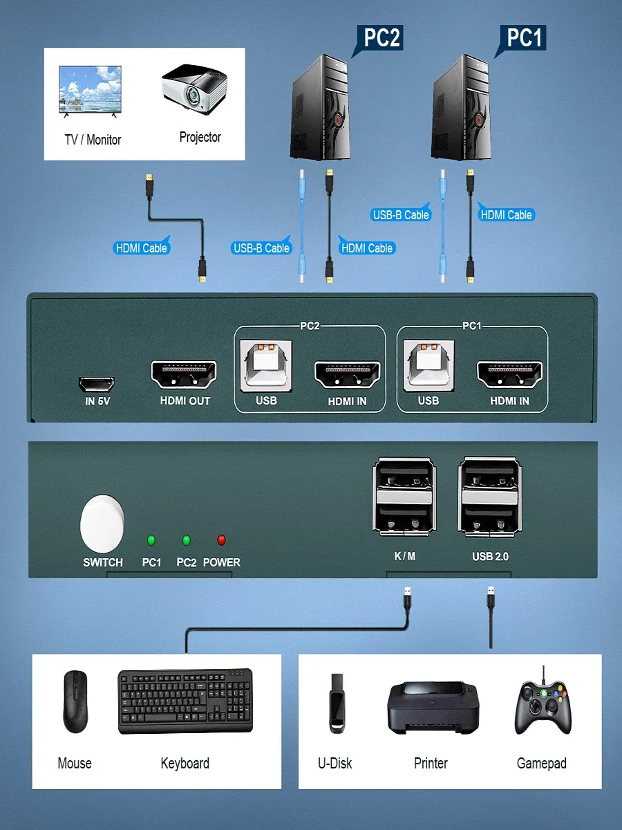 Conmutador KVM HDMIDosGrupos de fuente de audio y video de alta definición e interruptor libre de implementación de interfaz USB, EDID adaptable, pueden adaptarse a una variedad de entornos de aplicaciones complejas.El equipo tiene una excelente capacidad de procesamiento y transmisión de imágenes, hace que la señal de salida sea más suave y estable, es una forma confiable, de alto rendimiento y eficiente de interruptor USB HDMI