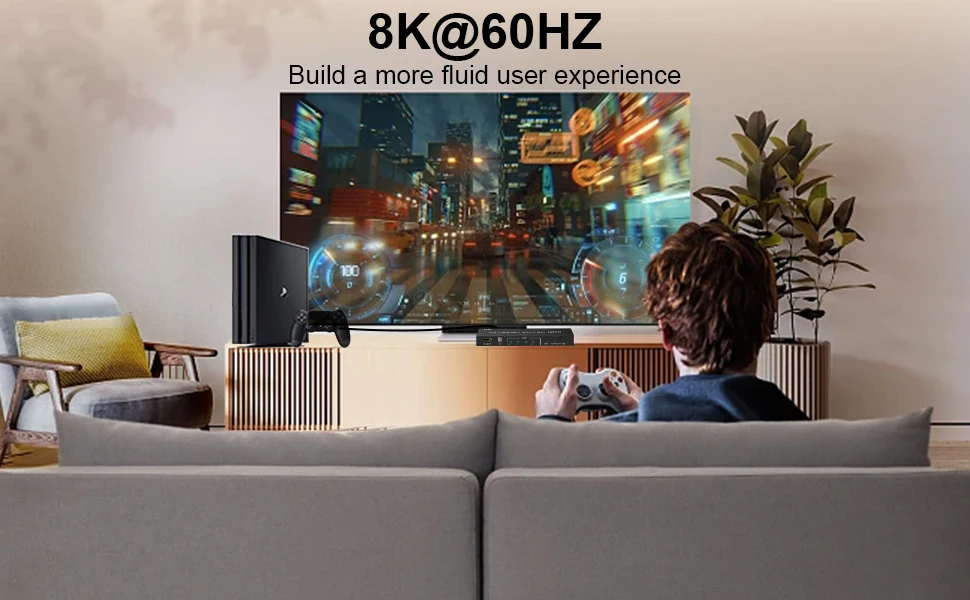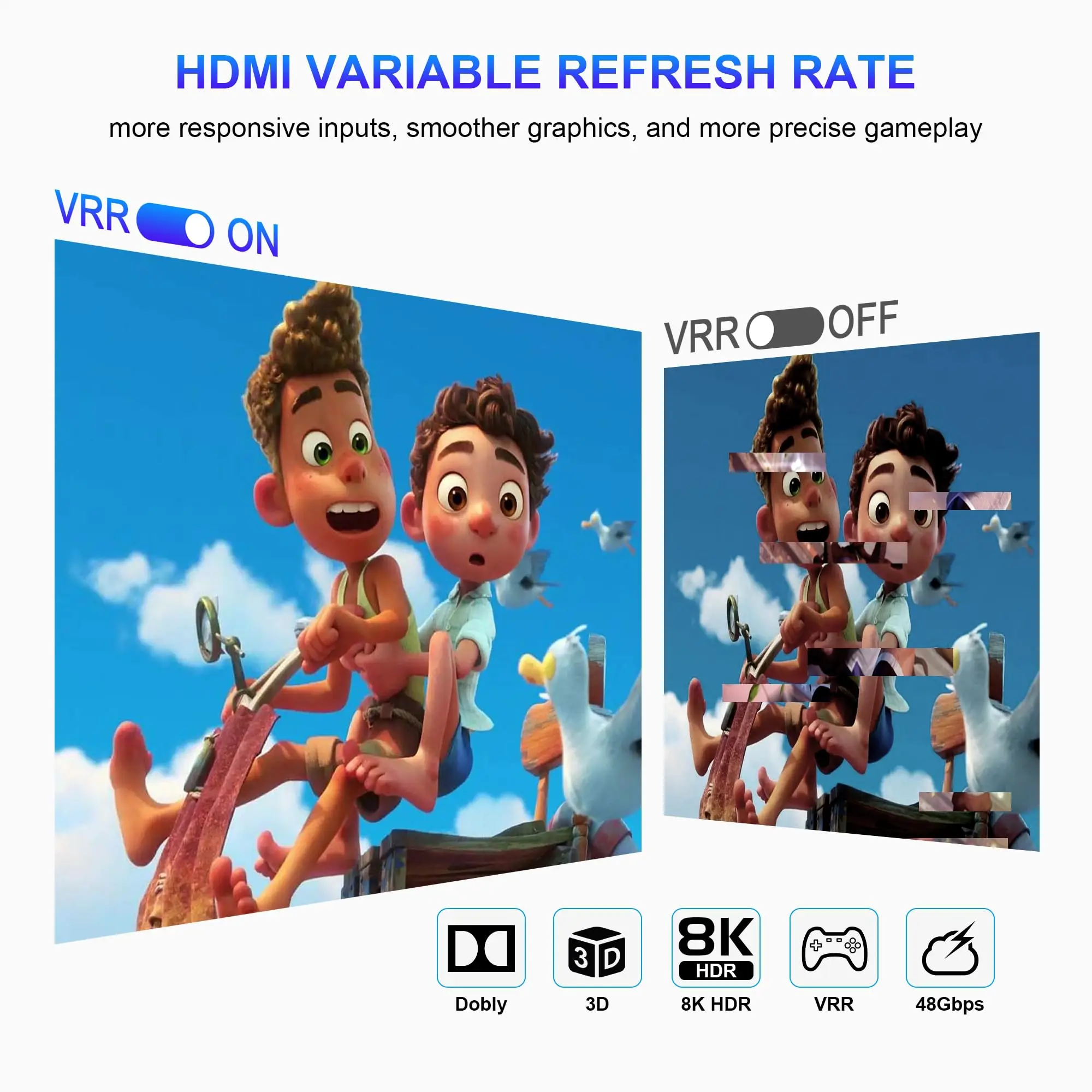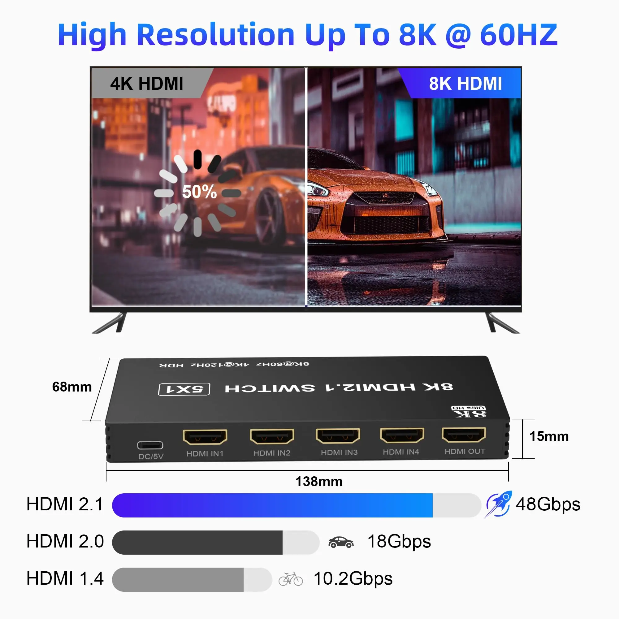 Pantalla de alta resolución 8K @ 60Hz y 4K @ 120Hz:Este interruptor HDMI 2,1 de aluminio admite impresionantes imágenes de alta resolución con hasta 8K @ 60Hz y 4K @ 120Hz. Además, es totalmente compatible con funciones avanzadas como CEC, VRR, HDR10 y Dolby Atmos, mejorando su experiencia audiovisual. Cuando cambia la señal HDMI, puede disfrutar de imágenes y audio ininterrumpidos de alta calidad sin retrasos