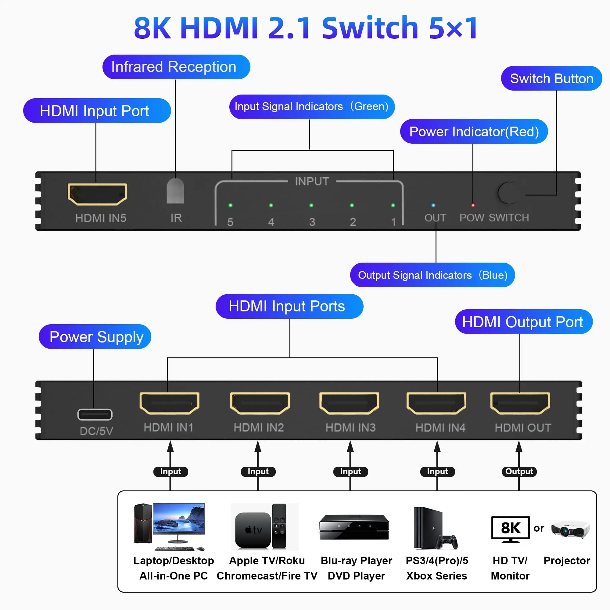 Conmutador HDMI 5 en 1 salida:Este interruptor HDMI de aluminio de 5 en 1 salida le permite conectar hasta 5 dispositivos HDMI, como consolas de juegos, cajas de TV, reproductores de DVD, etc., a una sola pantalla HDMI. Y el interruptor cuenta con 5 Indicadores LED que indican claramente el puerto activo actualmente, eliminando la necesidad de enchufar y desenchufar constantemente los cables HDMI. Perfecto para varios escenarios, incluyendo el hogar, la Oficina, reuniones y más