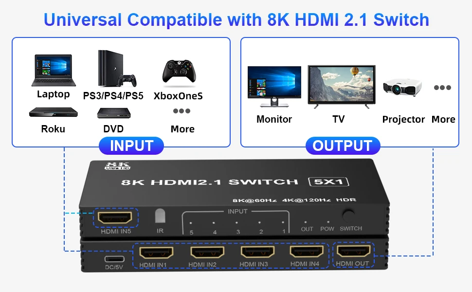 Amplia compatibilidad:Este interruptor HDMI 5 en 1 es compatible con la mayoría de dispositivos de fuente HDMI. Incluyendo HDTV, ordenador, reproductor de DVD, proyector, reproductores de Blu-ray, PS3, PS4, PS5 y otros dispositivos compatibles con HDMI