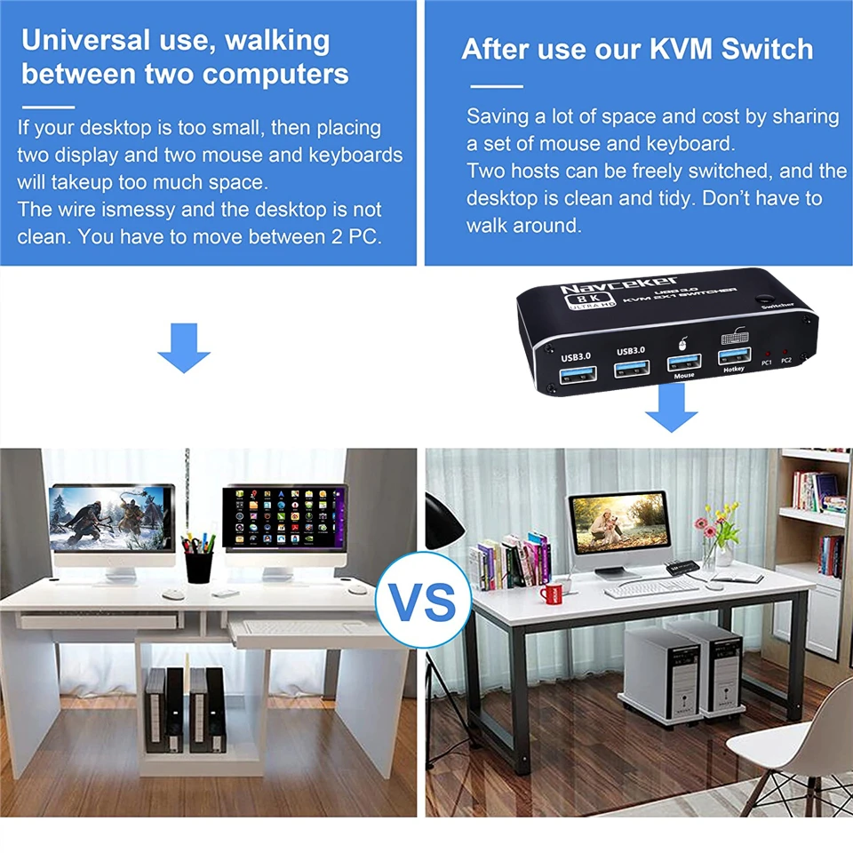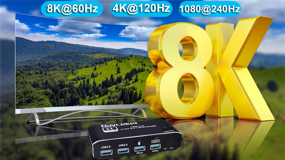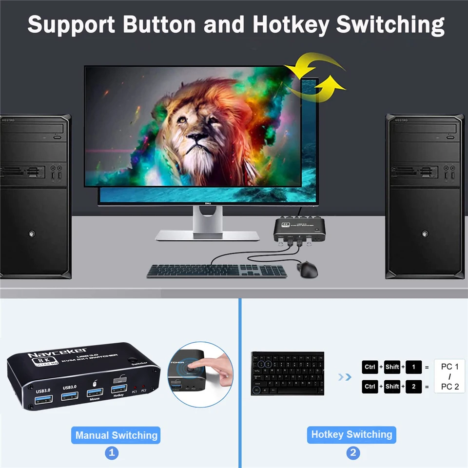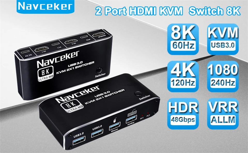 El conmutador KVM USB Navceker 8K HDMI te permite compartir un teclado USB, un ratón USB, un dispositivo USB 3,0 y un monitor HDMI para controlar 2 ordenadores, portátiles y consolas de juegos.