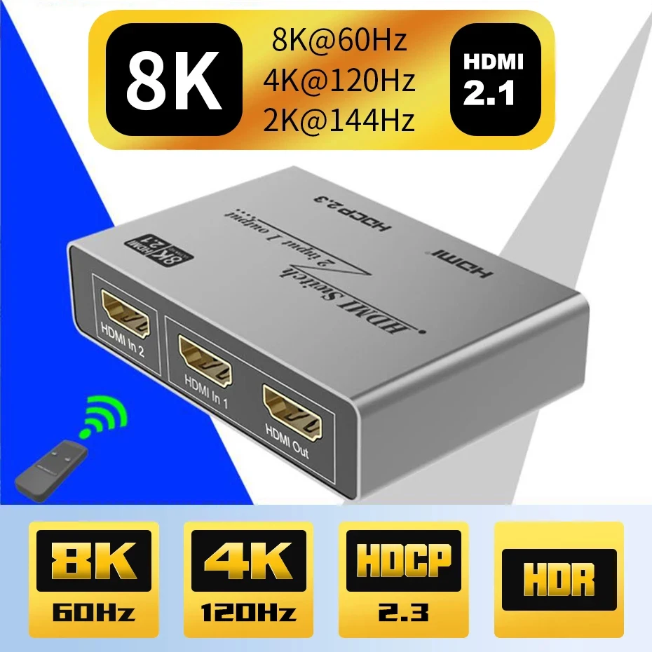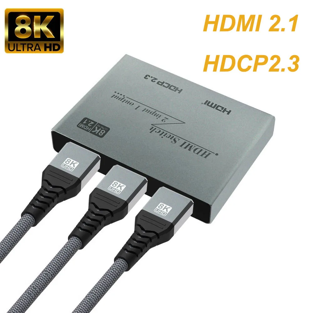 Conmutador 8K HDMI 2x1: admite resolución de hasta 8K @ 60Hz 4K @ 120HZ, proporciona velocidades de transferencia de hasta 48Gbps