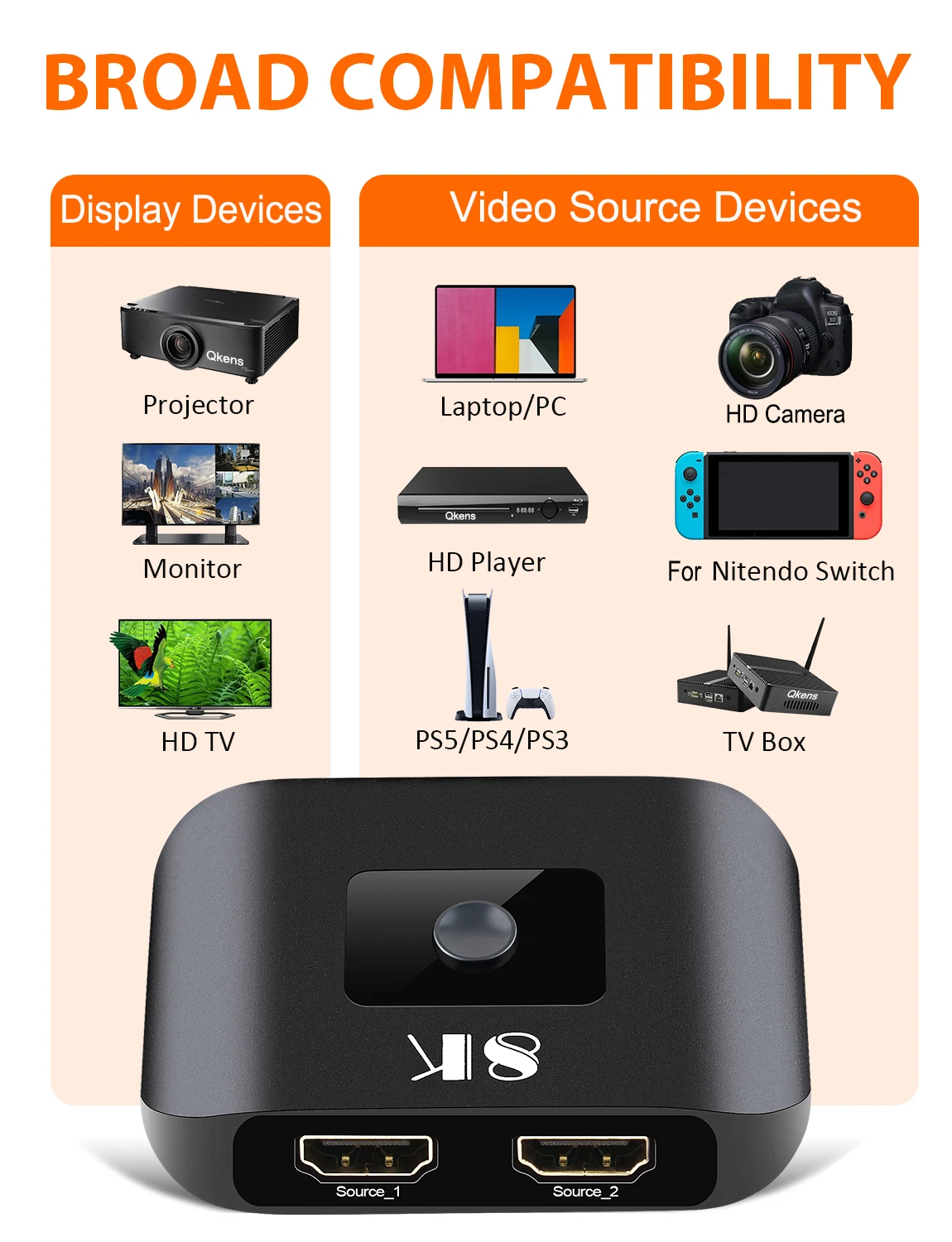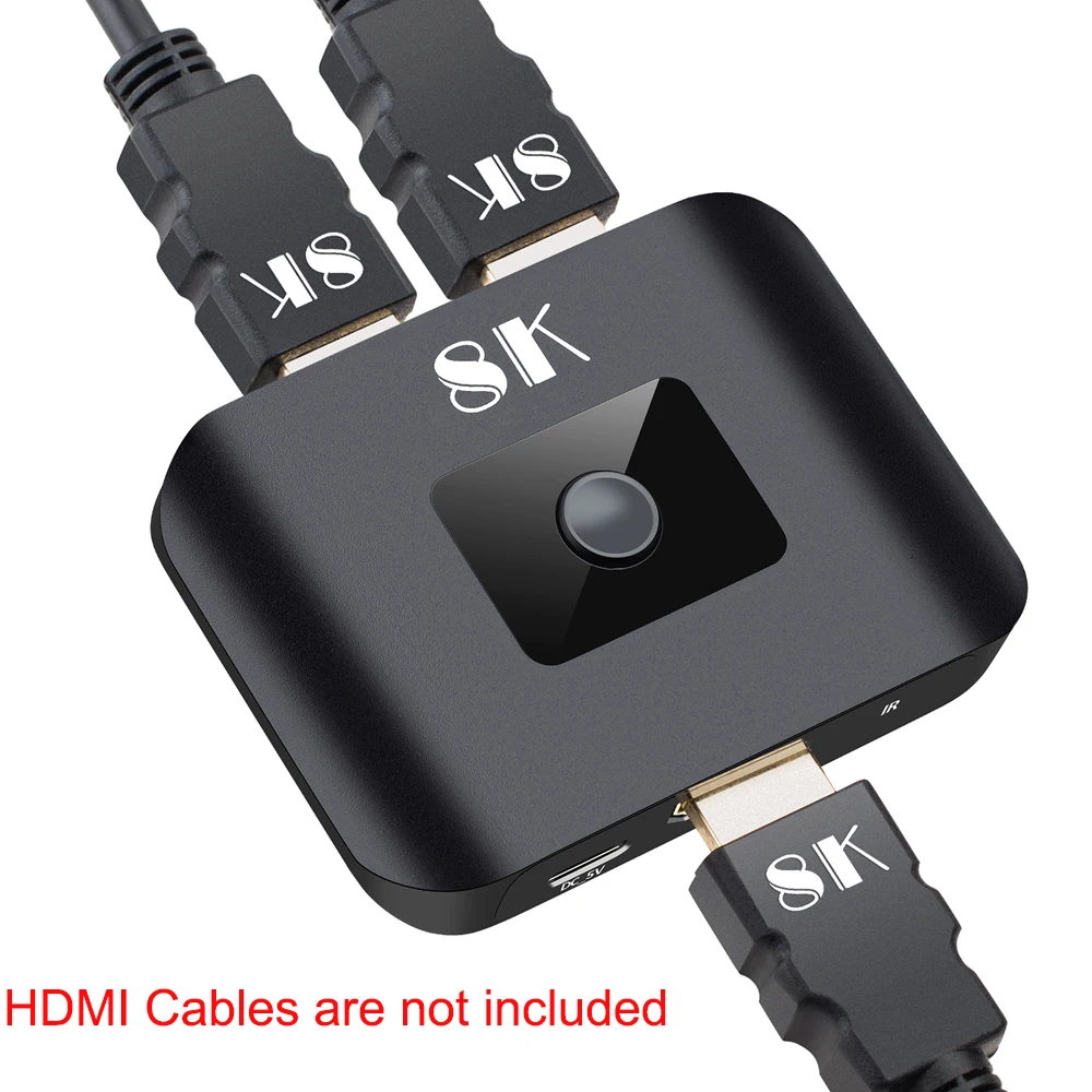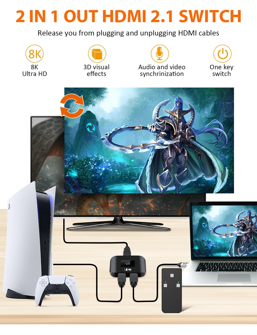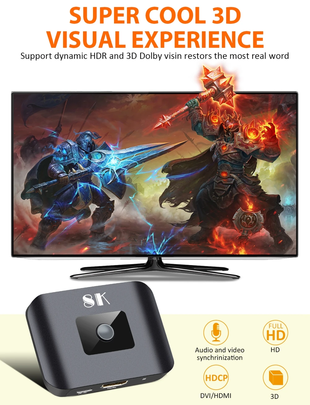 Dos interruptores de entrada HDMI a una salida de vídeo HDMI. Resolución de entrada y salida: hasta 8K @ 60Hz. Indicación LED: cuando la fuente o el fregadero están funcionando, el LED en relación con la luz. Compatible con HDR 3D, sin pérdida de calidad. Plug and Play, fácil de usar Necesita fuente de alimentación DC 5V