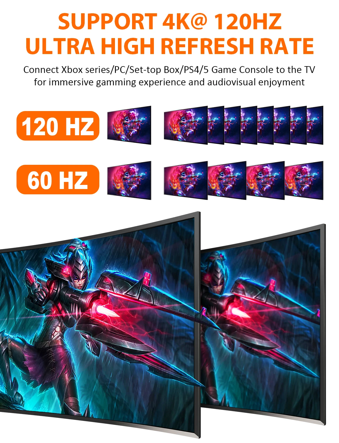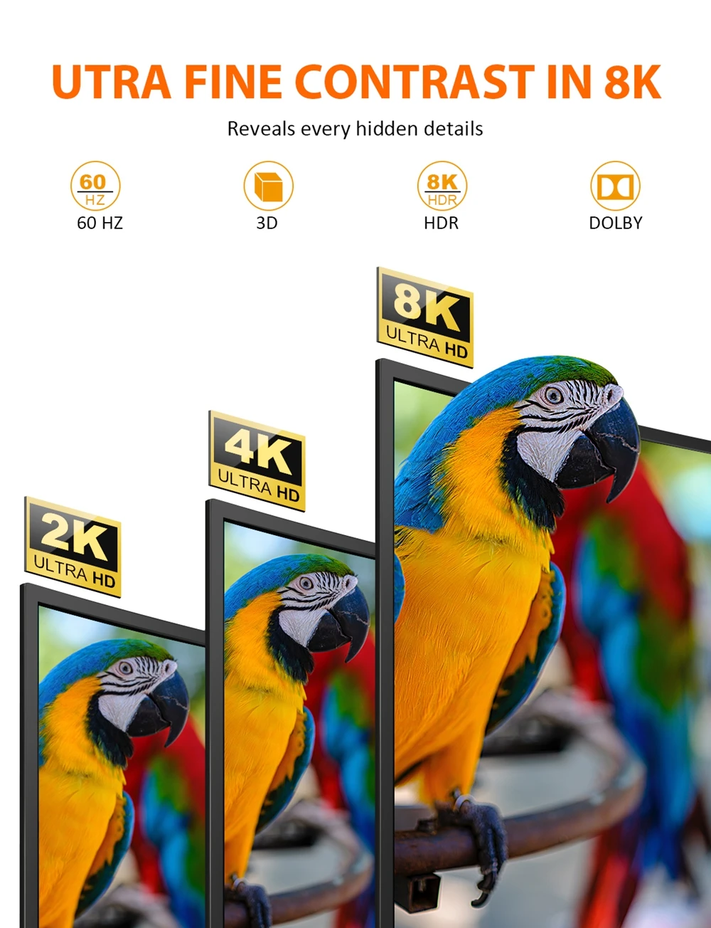Puntas cálidas: 1. Para obtener una resolución de 8K @ 60Hz, 4K @ 120HZ, tanto la fuente de video, el monitor como el cable HDMI deben ser HDMI 2,1. 2.Por favor, utiliza directamente nuestro producto en tus dispositivos HDMI, no lo uses con productos de terceros.