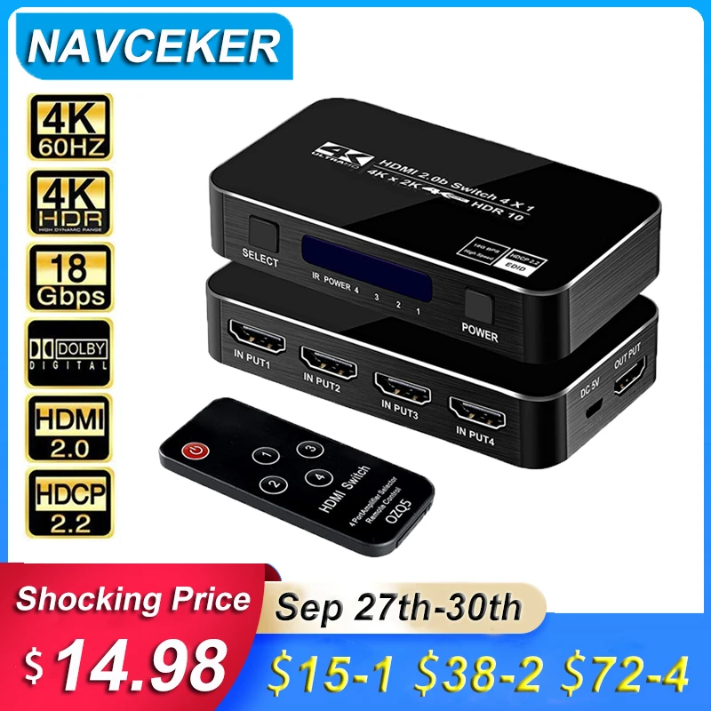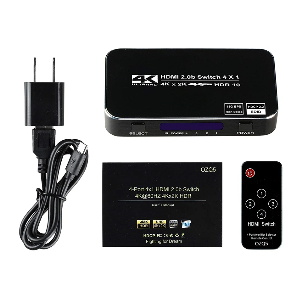(1) El color negro es Conmutador HDMI 4K a 60Hz, 4K a 60Hz, 4x1, compatible con YUV 4:4:4,RGB 4:4:4, control remoto IR, EDID,HDR 10, HDMI 2.0b y HDCP 2,2. (2) El color rojo es el interruptor de HDMI 2, 2, 0 y HDCP 2,2, 4K @ 60Hz 4x1 HDMI. Compatible con RGB 4:4:4,RGB 8:8:8(Dolby Atmos), control remoto IR, EDID,HDR 10.Características: