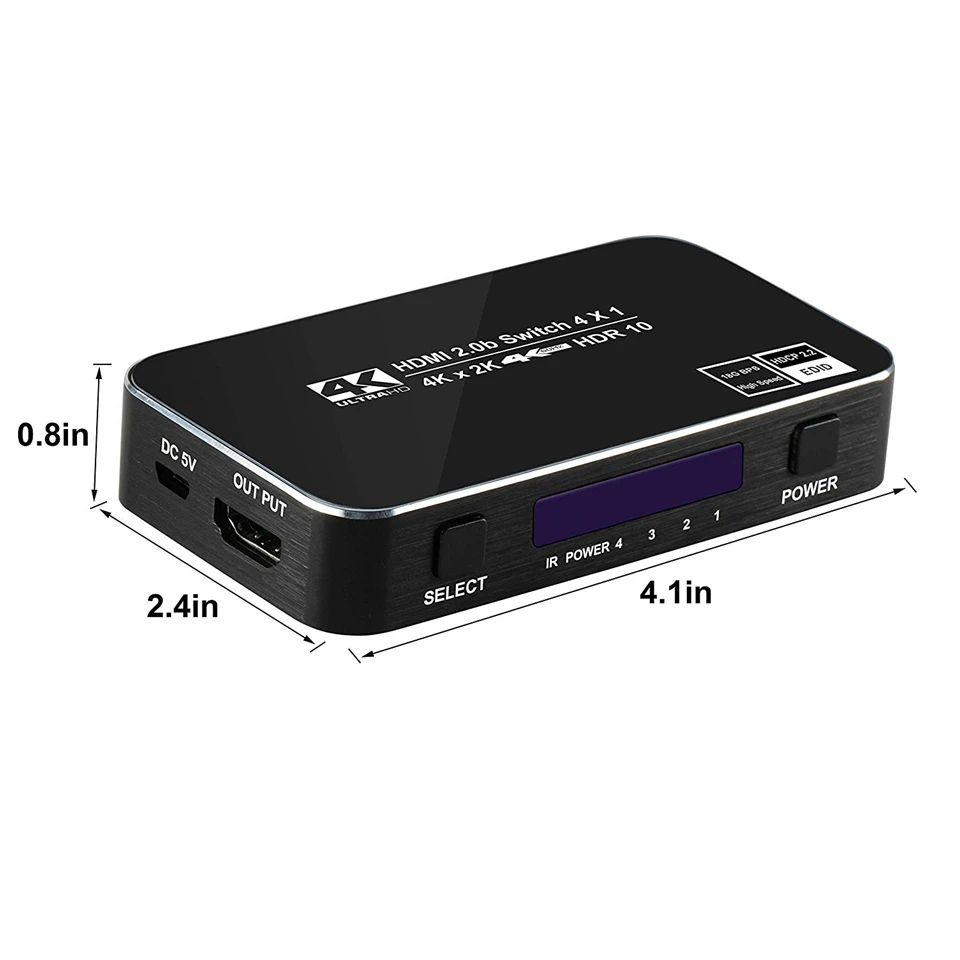 El conmutador HDMI es un conmutador HDMI 2,0 4K HDMI de 4 puertos para su última configuración de juegos y cine en casa. Admite 4 entradas HDMI y 1 salida HDMI, lo que permite HDMI 2,0 y HDCP 2,2, junto con 4K Ultra HD y compatibilidad en todos los HDMI.