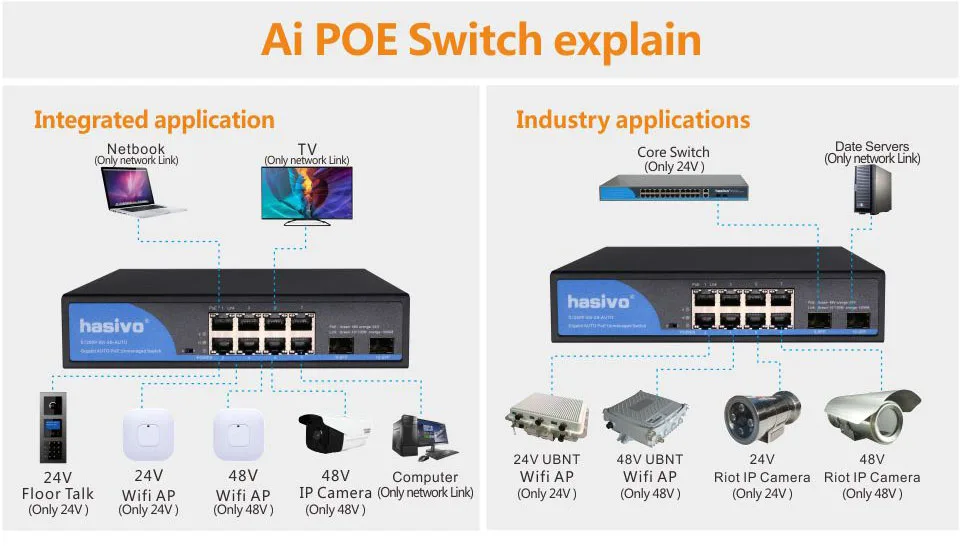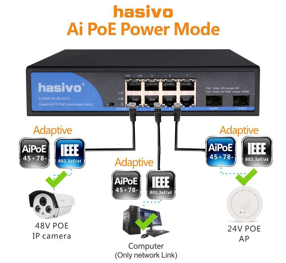 Comprar Interruptor de ID automática de 24V, 48V, POE, 8 puertos, gigabit, Ai distance PD activo y salida PoE pasiva adaptable