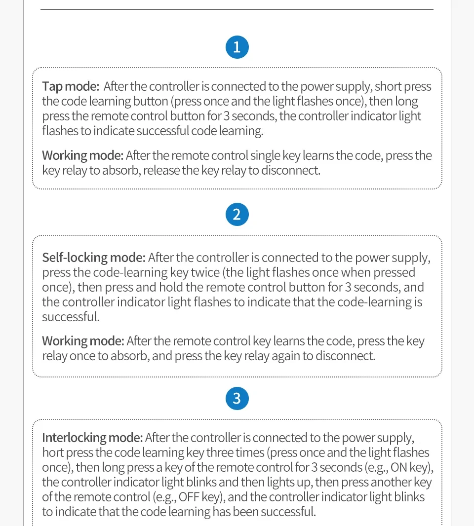 Modo de trabajo: modo momentáneo, modo de alternancia, modo de enclavamiento, modo de retardo de tiempo