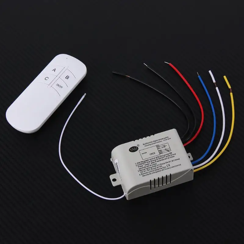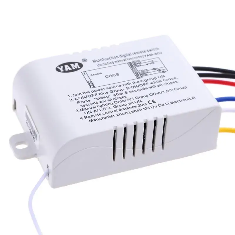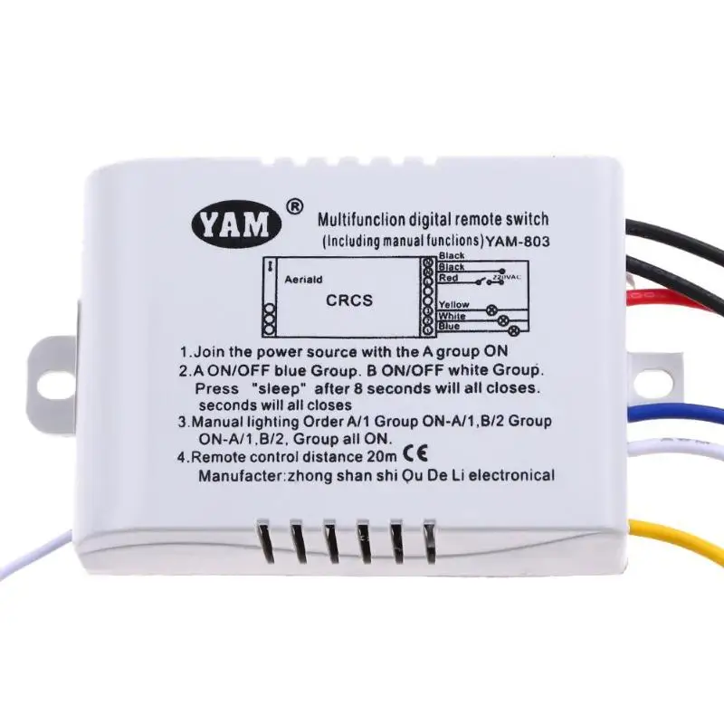 ![]() Características: Perfecto para el control remoto de droplight, lámpara de cristal, lámpara moderna de baja presión, luz de techo absorbente, lámpara de flor de día, lámpara fluorescente, lámparas de ahorro de energía, ventilador de escape, luz LED, etc. Instalación rápida y fácil, no obstruida por paredes, capaz de conectar cualquier carga. El mando a distancia y el interruptor se pueden utilizar simultáneamente para mayor facilidad y flexibilidad. Cada juego de interruptores de control remoto tiene su código especial. Se pueden usar más juegos en una habitación sin interferencias. Interruptor de control remoto unidireccional: Función: ON/OFF y A, función de encendido y apagado. (B es una tecla vacía, sin efecto) Presione SLEEP, la luz parpadeará una vez. Entonces no mueva el interruptor del control remoto y apáguelo en unos 8-12 segundos. Especificaciones: Distancia de control remoto: dentro de 30m Voltaje de entrada: 180-240V Carga de cada puerto: lámpara fluorescente: 600W; lámpara ahorradora de energía: 300W Temperatura de trabajo:-20C + 60c Material: ABS Tamaño: control remoto: 11M * 4,2 cm * 1,5 cm; dispositivo principal: 6,0 cm x 4,5 cm x 2,5 cm Potencia: batería de 12V 23A (no incluida) Interruptor de control remoto bidireccional: Función: 1.A/1 se encenderá después del encendido. 2. A/1 se usa para encender/apagar el grupo azul, B/2 se usa para encender/apagar el grupo verde, ''ON"/"OFF" significa encender/apagar todo el artículo. 3. Secuencia de iluminación manual (control del interruptor de pared): A / 1 , B / 2, se encenderá todo el circuito. Especificaciones: 1. Cada Grupo puede llevar la bombilla incandescente de 1000W y la lámpara de ahorro de energía de 300W. 2. Voltaje de funcionamiento:/60Hz 3. Batería de control remoto: batería de 12V 23A (batería no incluida) 4. Distancia de control remoto: 30m 5. Potencia de carga: 1 6. Carga resistiva: la mayor potencia de salida de un solo grupo dentro de 3000W.(Como luz incandescente o bombilla, etc.) Interruptor de control remoto de tres vías: Función: 1.A/1 se encenderá después del encendido. 2. A/1 usa para encender/apagar el grupo azul, B/2 usa para encender/apagar el grupo blanco, C/2 usa para encender/apagar el grupo amarillo, "ON"/"OFF" significa encender/apagar todo el artículo. 3. Secuencia de iluminación manual (control de interruptor de pared): A/1 , B/2 , C/3, se encenderá todo el circuito. Especificaciones: 1. Voltaje de funcionamiento:/60Hz 2. Batería de control remoto: batería de 12V 23A (batería no incluida) 3. Distancia de mando: (interior) superior a 20-30 m. 4. Potencia de carga: 1 5. Carga resistiva: la mayor potencia de salida de un solo grupo dentro de 1000W.(como luz incandescente o bombilla, etc.) ![]() 1 receptor de control remoto 1 x emisor de control remoto