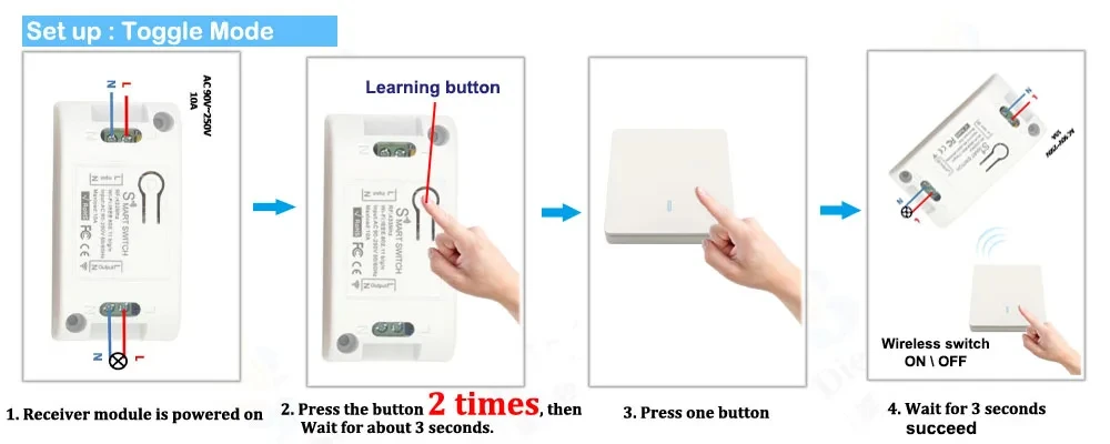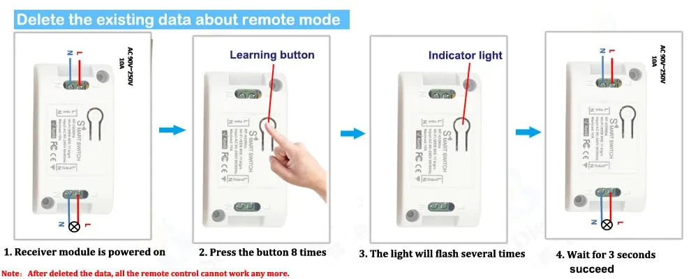 Presione el aprendizaje en el controlador dos veces seguidas, la luz indicadora LED en el controlador parpadeará y luego se encenderá, espere a que la luz indicadora LED se encienda y luego presione la tecla del control remoto que debe emparejarse, la luz indicadora LED en el El controlador parpadeará 3 veces seguidas y luego se apagará, el emparejamiento se realizó correctamente.
