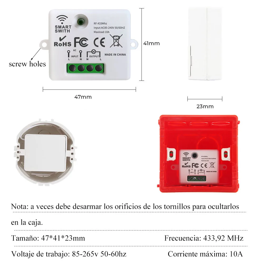 El interruptor de pared tiene tornillos y cintas de doble cara, el transmisor remoto tiene base