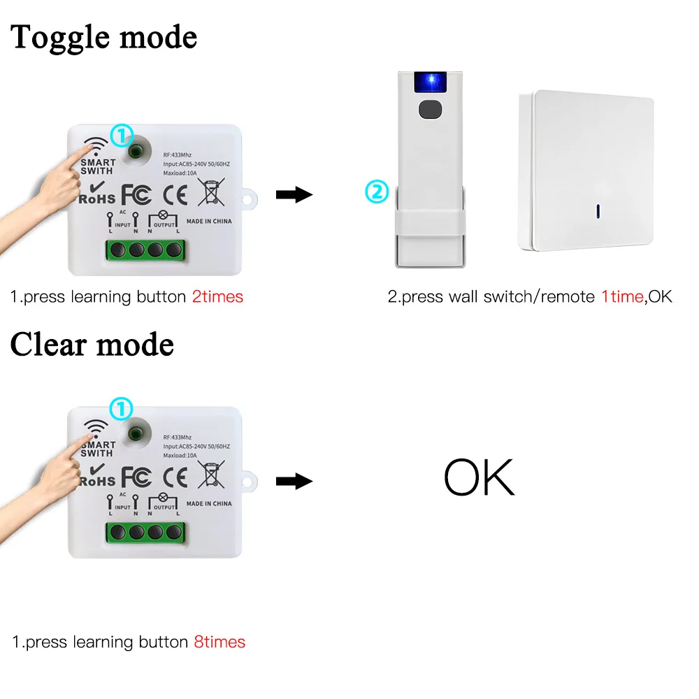 Presione el botón de aprendizaje 2 veces, presione el interruptor de pared/botón remoto 1 vez, tenga éxito.
