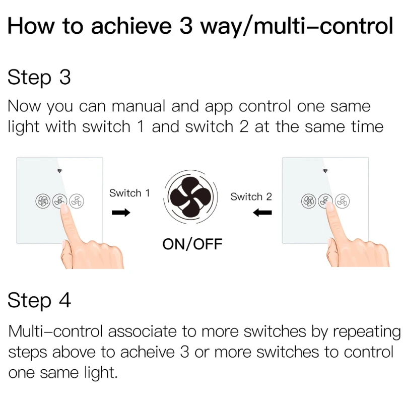 Asociación MultiControl de 1,2/3 vías para controlar 1 ventilador de techo con interruptores; el panel de vidrio templado antiarañazos se adapta a cualquier decoración del hogar y permite un control táctil sin esfuerzo; puede asociar MultiControl este interruptor a diferentes interruptores en la aplicación Smart Life.