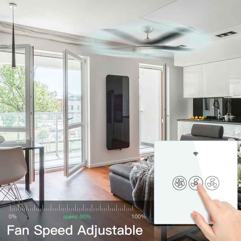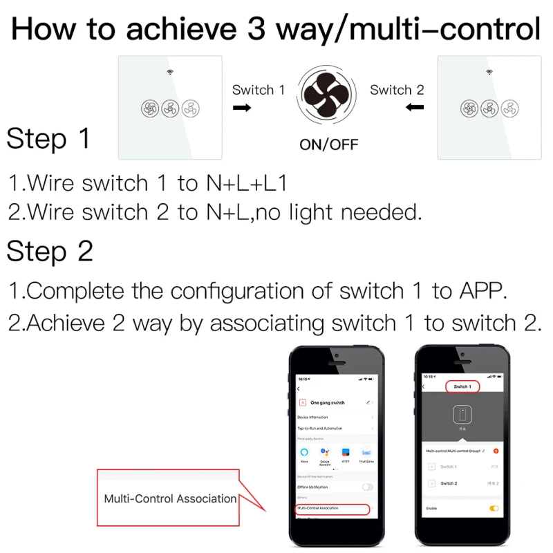 Asociación MultiControl de 1,2/3 vías para controlar 1 ventilador de techo con interruptores; el panel de vidrio templado antiarañazos se adapta a cualquier decoración del hogar y permite un control táctil sin esfuerzo; puede asociar MultiControl este interruptor a diferentes interruptores en la aplicación Smart Life.