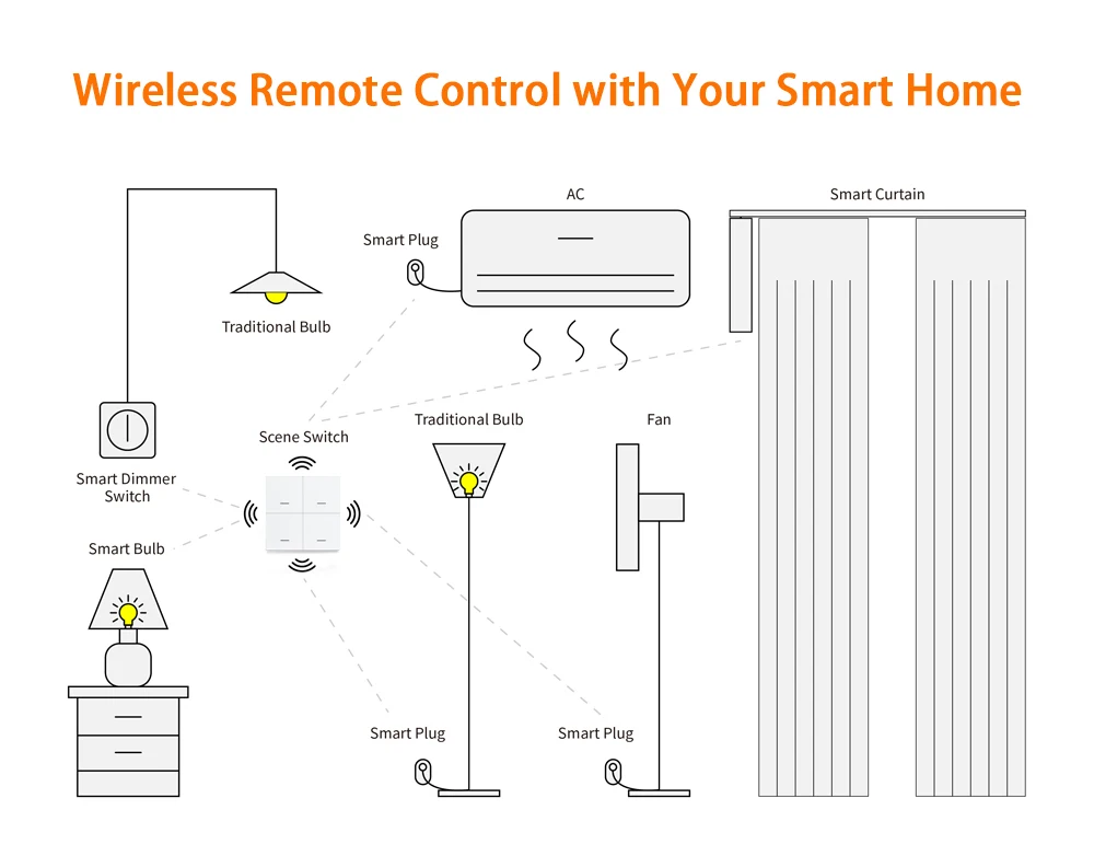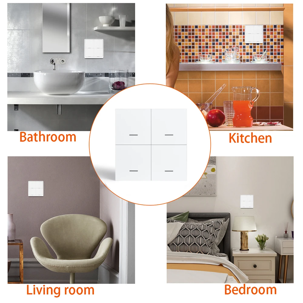 El interruptor de escena es una alternativa que ahorra tiempo y energía al interruptor tradicional de hardware. El botón puede pegarse en la pared o colocarlo como desee.