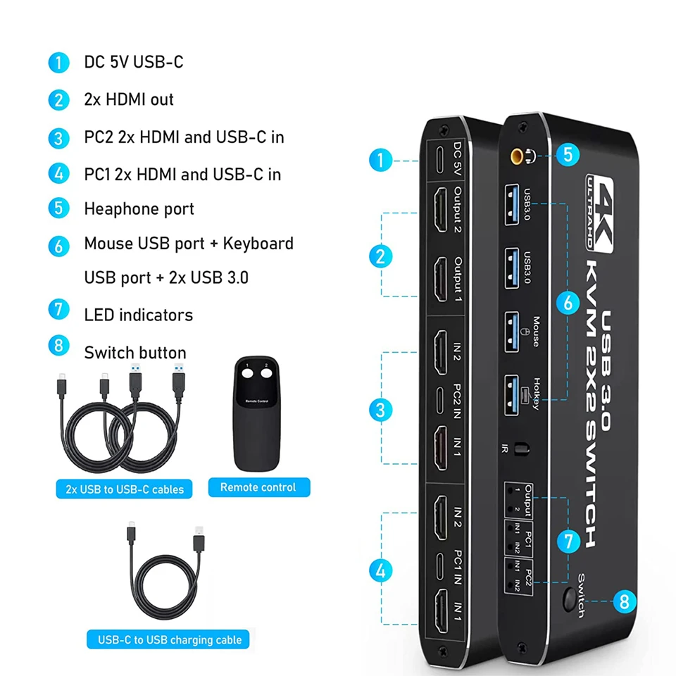 2 In 2 Out 4K USB 3,0 HDMI KVM Switch Box Monitor dual para 2 PC Sharing Keyboard Mouse Printer Plug Play Video 2 Display USB Swltch Splitter