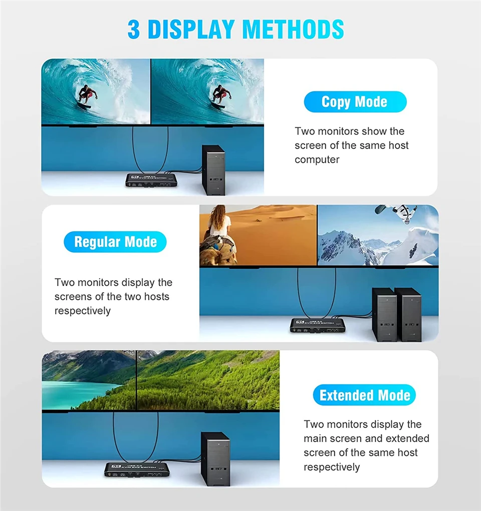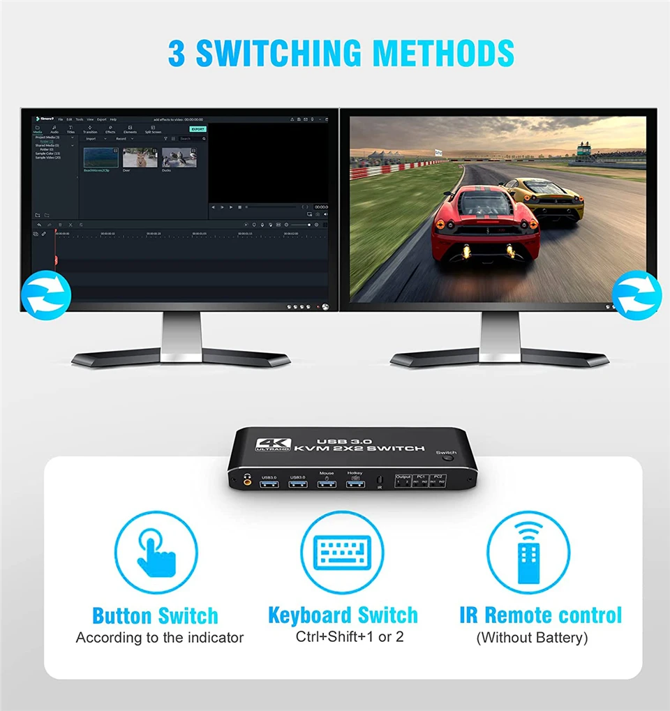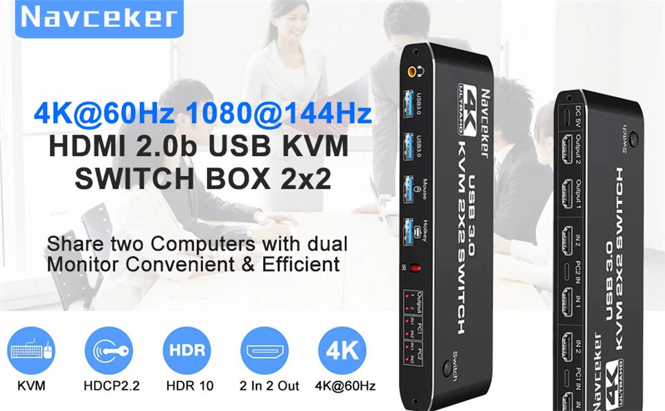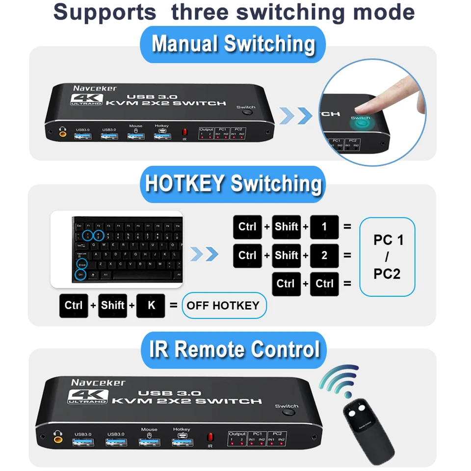 El conmutador KVM USB Navceker 4K HDMI le permite compartir un teclado USB, un ratón USB y dos monitores HDMI para controlar 2 ordenadores, portátiles y consolas de juegos.