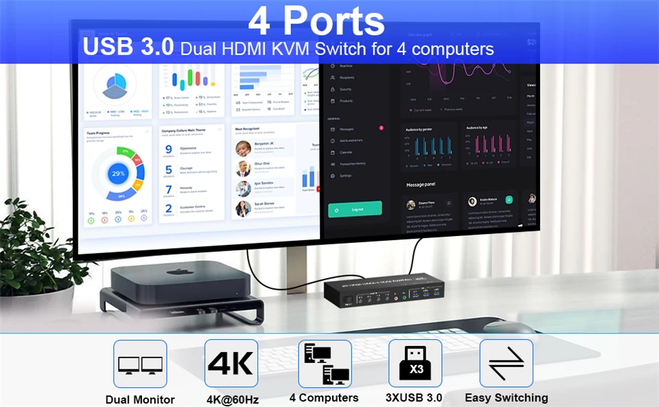 4 ordenadores/portátiles comparten un juego de teclado, ratón y monitores duales, y más periféricos USB 3,0;