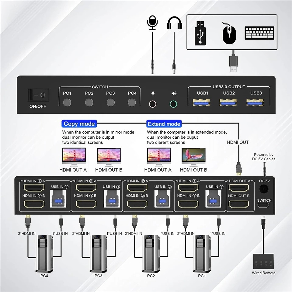 Conmutador KVM de monitor dual USB 3,0, HDMI de 4 puertos: este conmutador KVM de monitor dual es para que los controle usando un juego de teclado, ratón y monitores individuales o duales para que su espacio de trabajo esté ordenado y sea eficiente, también una opción premium para trabajar desde casa. Solo cuando su ordenador admite pantalla dual o pantalla múltiple, puede usar este KVM para lograr 4 PC para compartir 2 monitores. (Los modos de visualización extendidos, reflejados o empalmados dependen de la tarjeta gráfica de su ordenador).