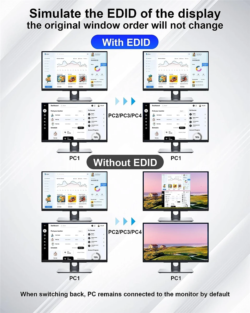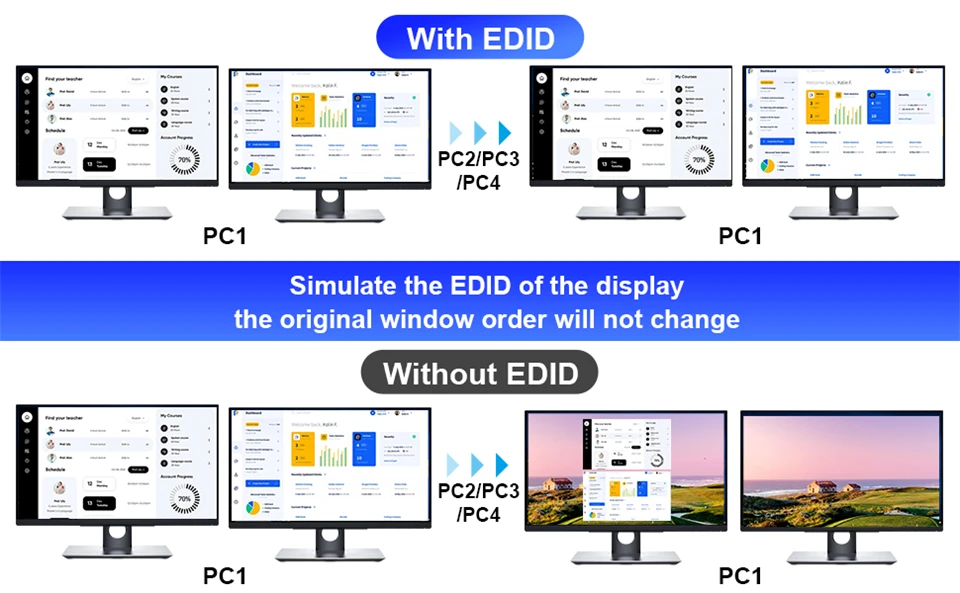El interruptor KVM de monitor dual USB3.0 puede simular el EDID de la pantalla, cuando el monitor se cambia entre 4 ordenadores, el orden de la ventana original no cambiará.