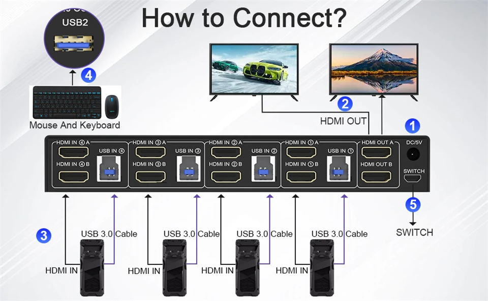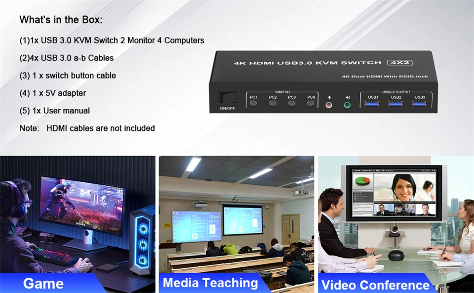 El conmutador KVM Navceker 4K 60Hz 4x2 HDMI USB 3,0 le permite compartir un teclado USB, un ratón USB y dos monitores HDMI para controlar 4 ordenadores, portátiles y consolas de juegos.