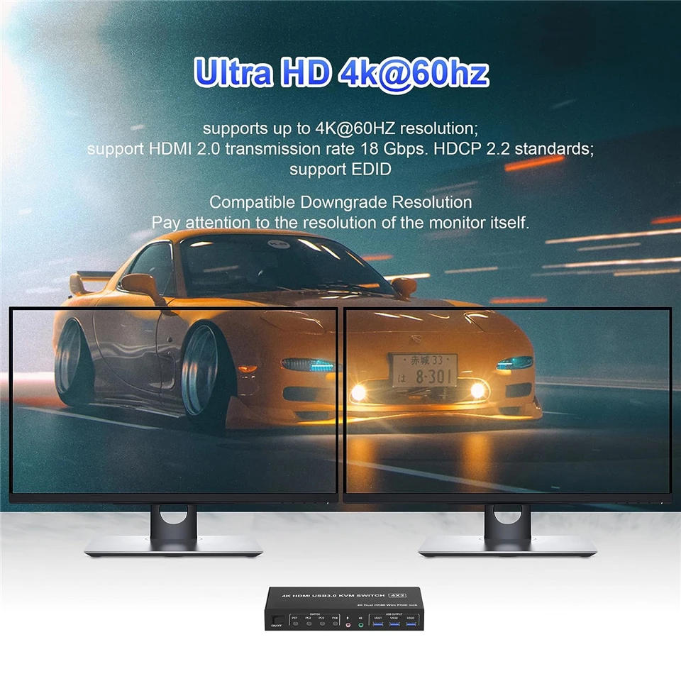 USB 3,0 Monitor Dual 4 puertos (HDMI + HDMI) Conmutador KVM 4K @ 60Hz