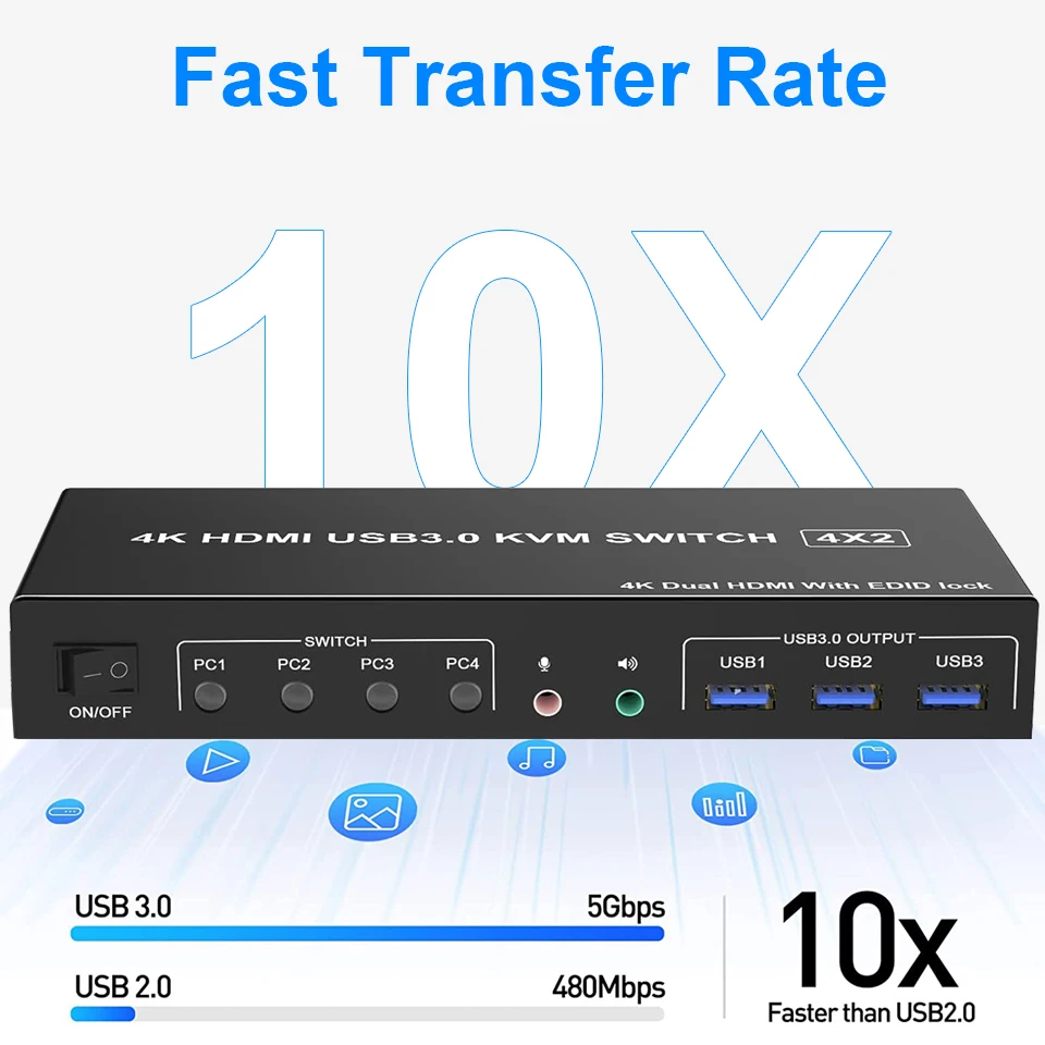 3 puertos USB 3,0: este conmutador KVM HDMI de monitor dual con 3 puertos USB 3,0 puede reconocer el ratón del teclado con cable/inalámbrico, U-disk, impresora u otros dispositivos USB. USB3.0 tiene una velocidad de transferencia de datos más rápida de hasta 5Gbps, compatible con dispositivos USB 2,0/1,1, mientras que USB2.0 tiene una velocidad de transferencia de datos de 480Mbps.