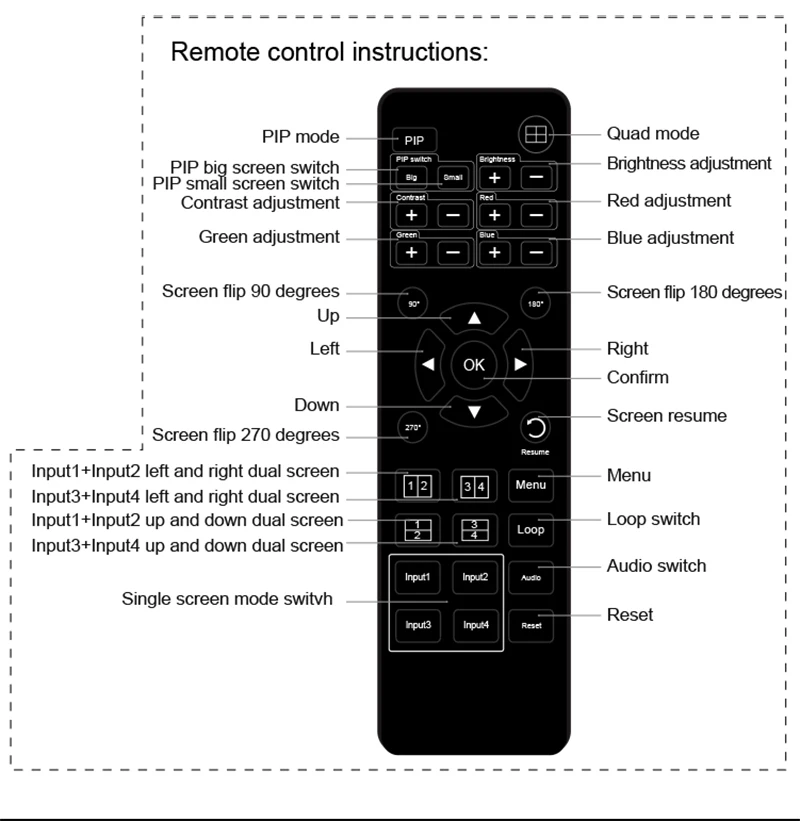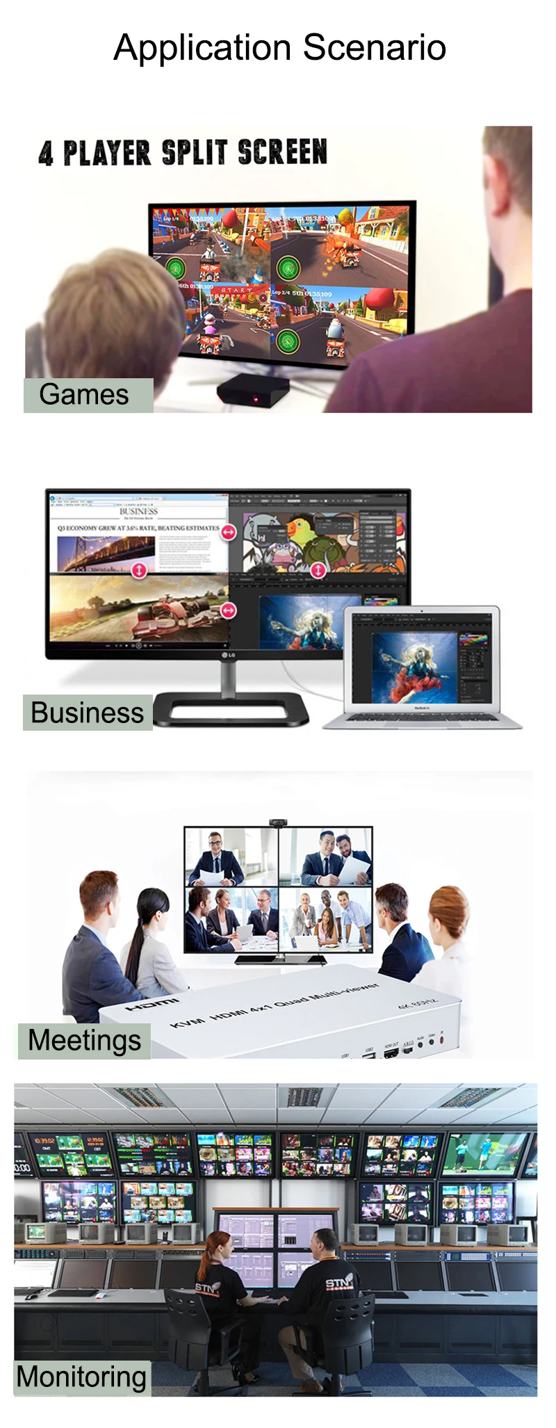 Puede mostrar la señal de vídeo digital 4 HD en la misma pantalla y tiene una variedad de segmentación de vídeo, conmutación continua de la señal de entrada 4 HD de forma sincrónica.