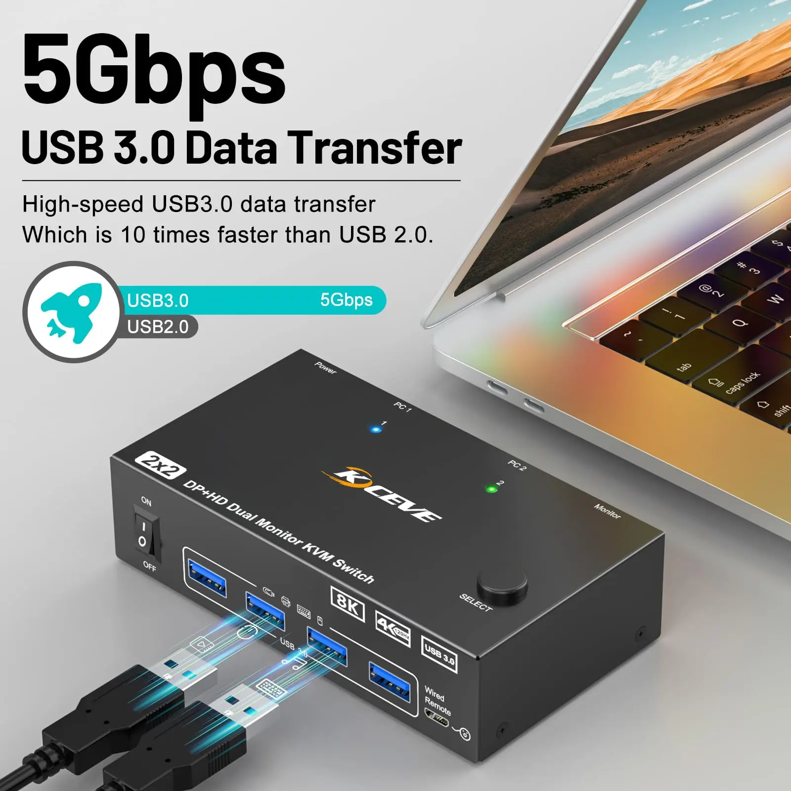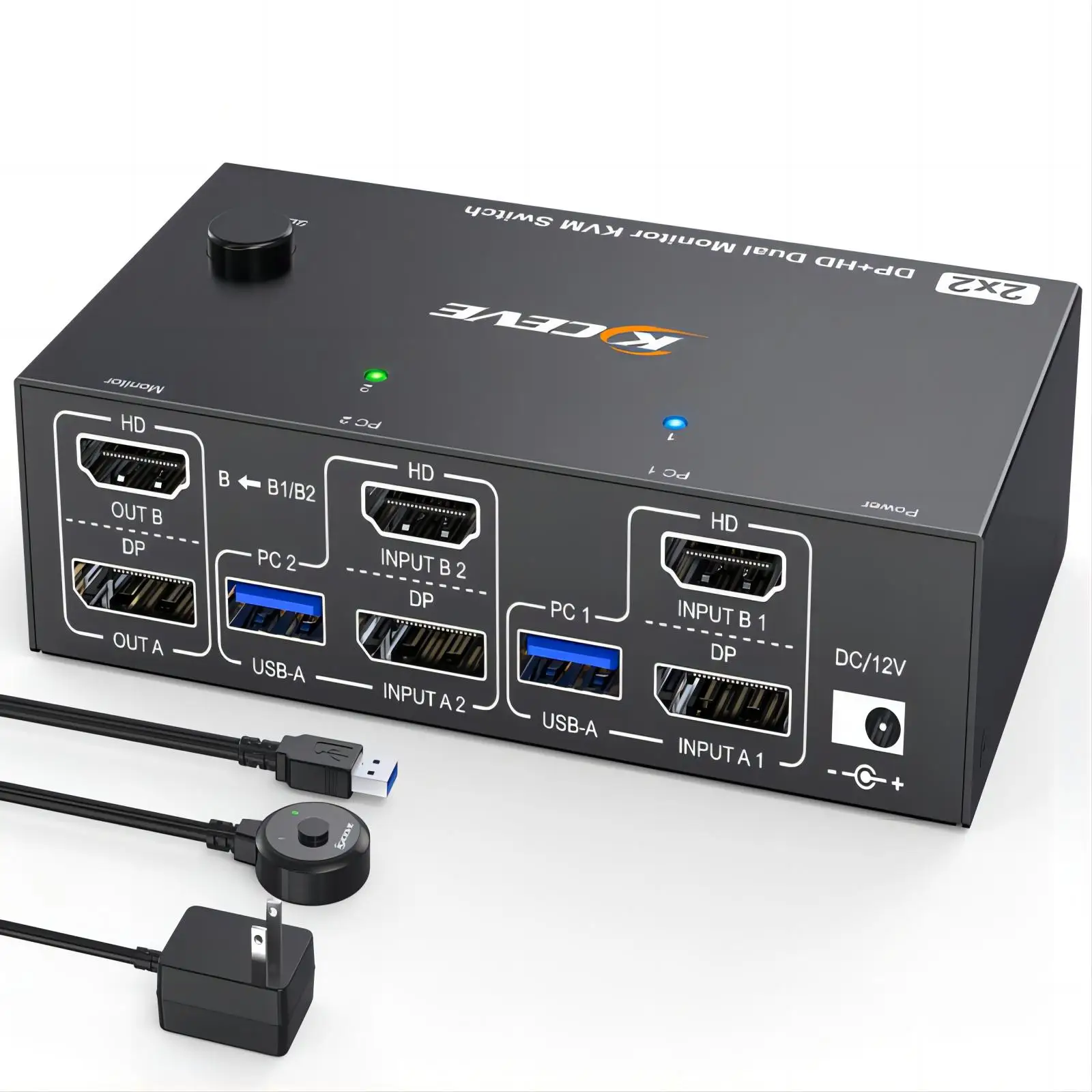Comprar Interruptor KVM 8K, 2 monitores, 2 ordenadores, HDMI + Displayport, Monitor Dual, interruptor KVM con 4 puertos USB 3,0 para impresión de teclado y ratón