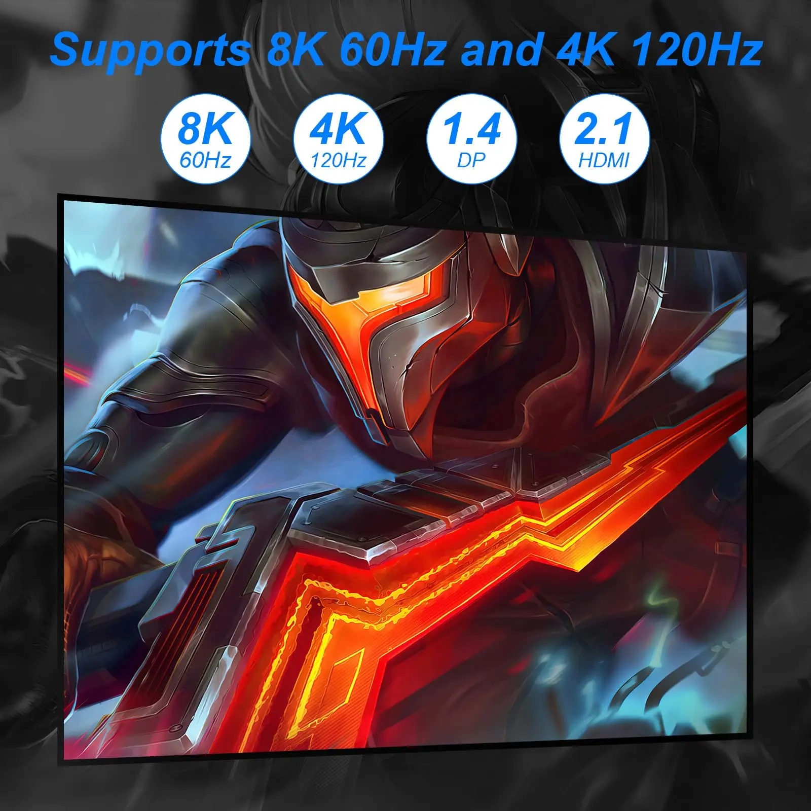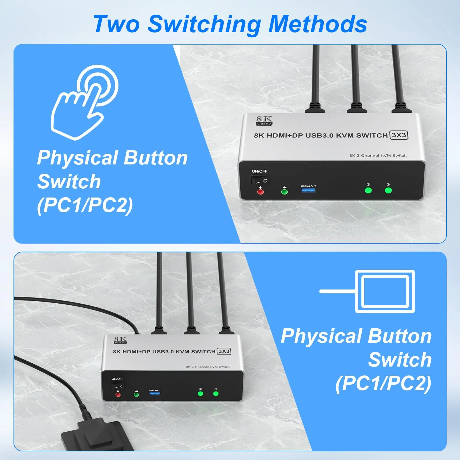 【Conmutador KVM 3 monitores 2 ordenadores compatibles con Ultra HD 8K @ 60Hz 】3 monitores KVM Switch DisplayPort: admite resolución de hasta 8K @ 30Hz/4K @ 144Hz. 3 Monitor KVM Switch HDMI: admite resolución de hasta 8K @ 60Hz/4K @ 60Hz/2K @ 60Hz y retrocompatible con resolución más baja. Nota: La resolución final también está sujeta a tarjetas gráficas, monitores, cables y adaptadores.
