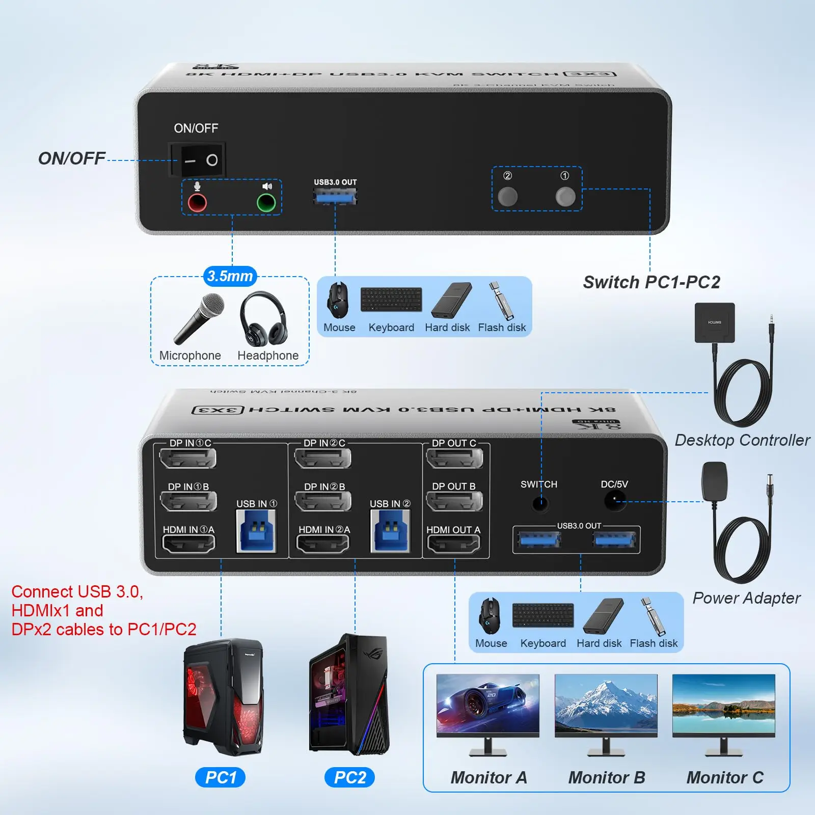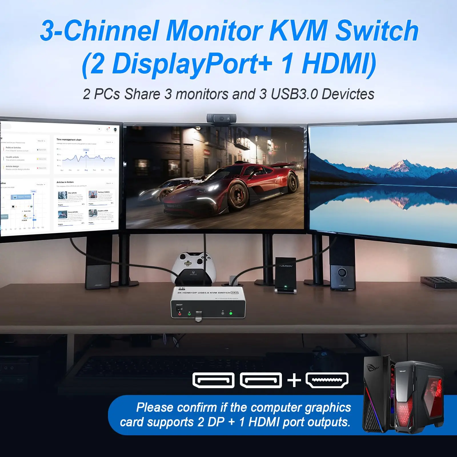 Comprar Interruptor KVM 8K @ 60Hz HDMI + 2 Displayport, 3 monitores, 2 ordenadores, Triple Monitor, interruptor KVM para 2 ordenadores, compartir 3 monitores, micrófono de Audio
