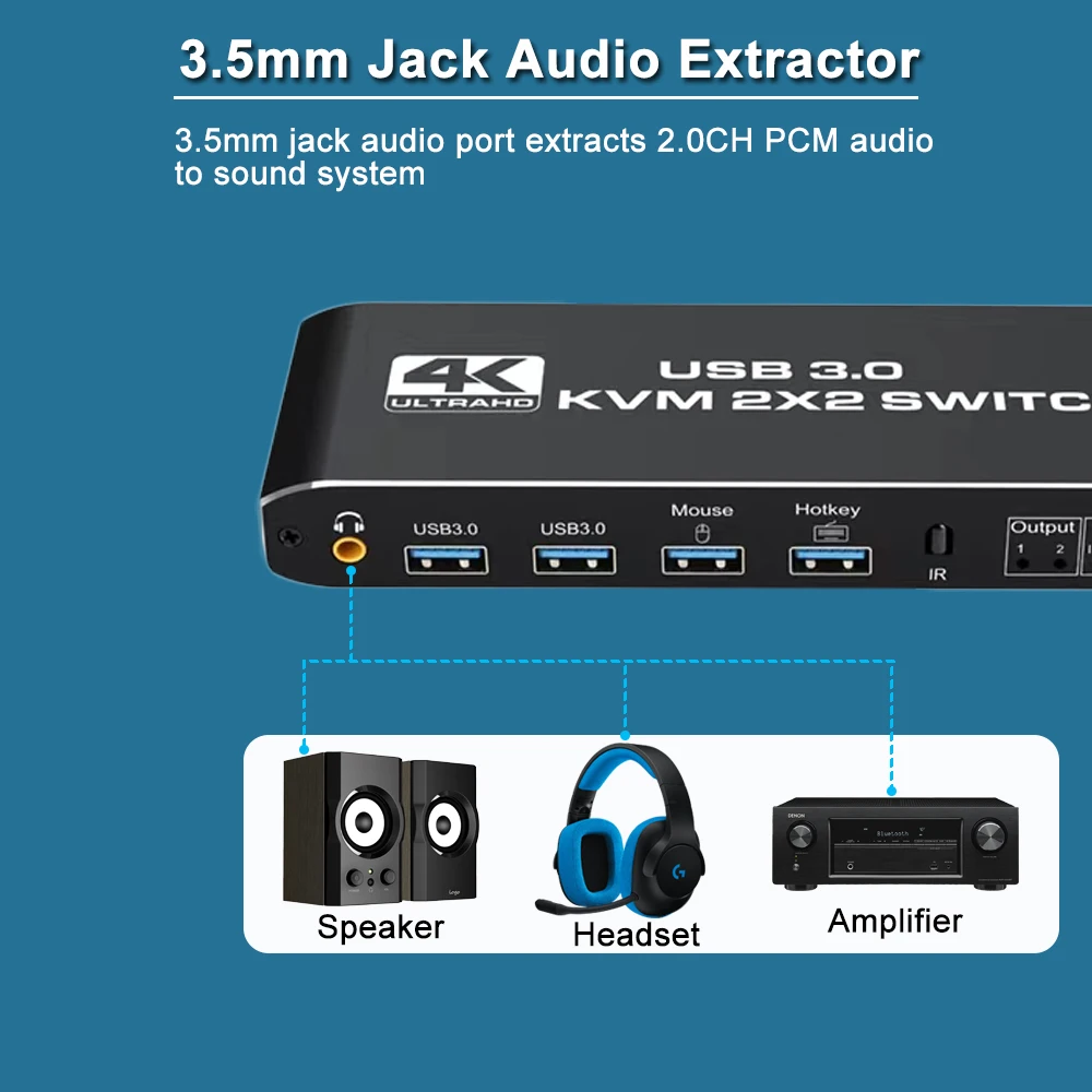 [Extractor de audio 2.0CH]:El conmutador KVM viene con un puerto conector de audio de 3,5mm con un chip DAC en el interior, que se puede insertar en un auricular de 3 segmentos de 3,5mm.