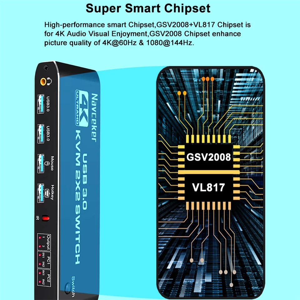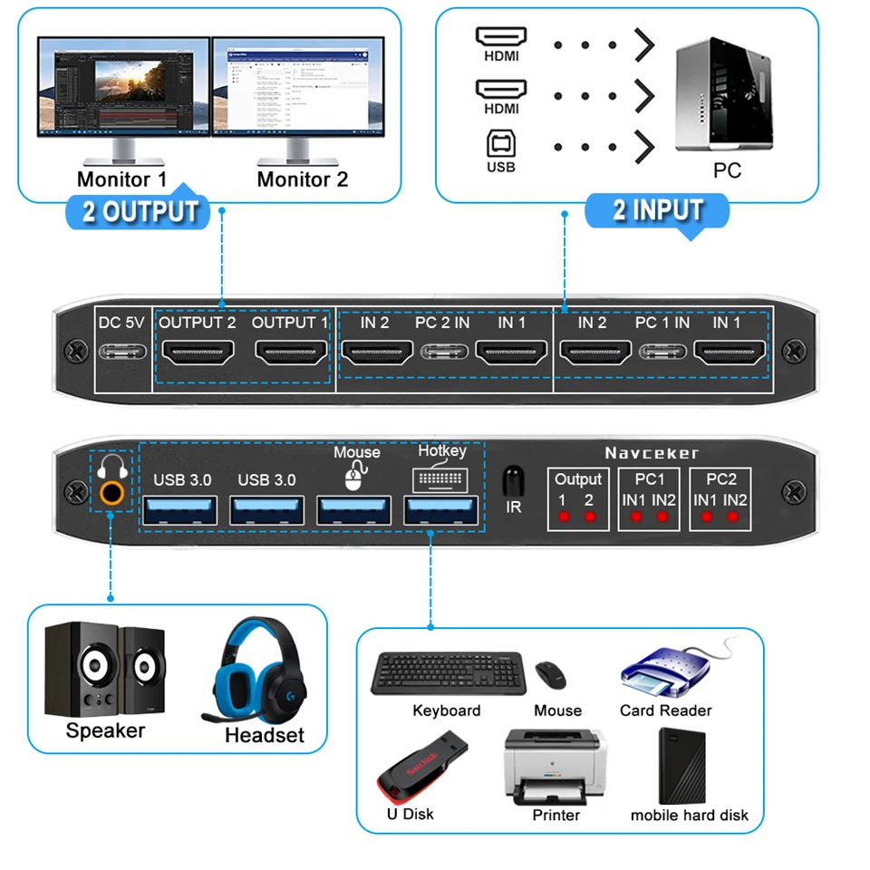 El conmutador KVM USB Navceker 4K HDMI le permite compartir un teclado USB, un ratón USB y dos monitores HDMI para controlar 2 ordenadores, portátiles y consolas de juegos.