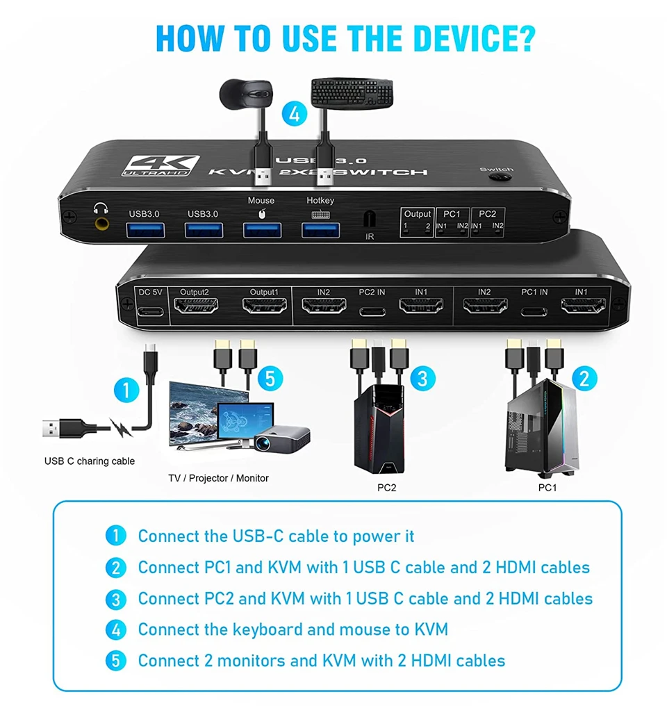 5. Use este interruptor KVM Cuando, enciéndalo en primer lugar y use nuestro cable de datos de USB 3,0 a La USB-C.
