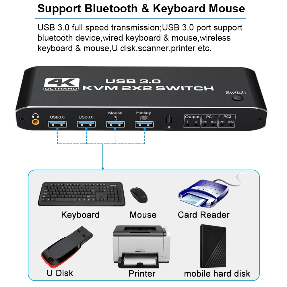 Conmutador KVM HDMI dual con puertos USB 3,0]: admite la conexión de sus dispositivos de Puerto USB 3,0, como escáner/ratón USB/impresora/monitor.