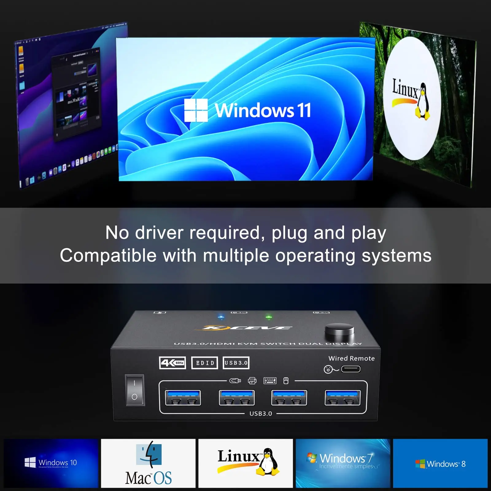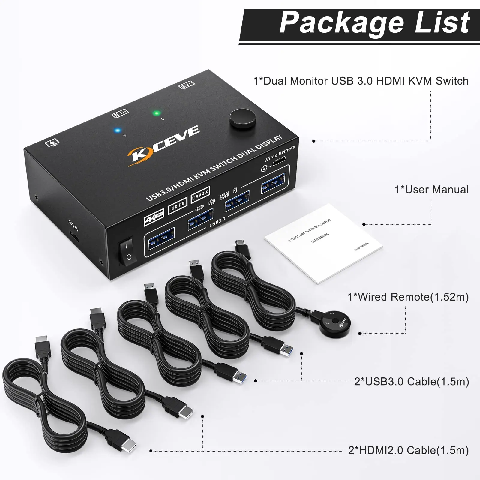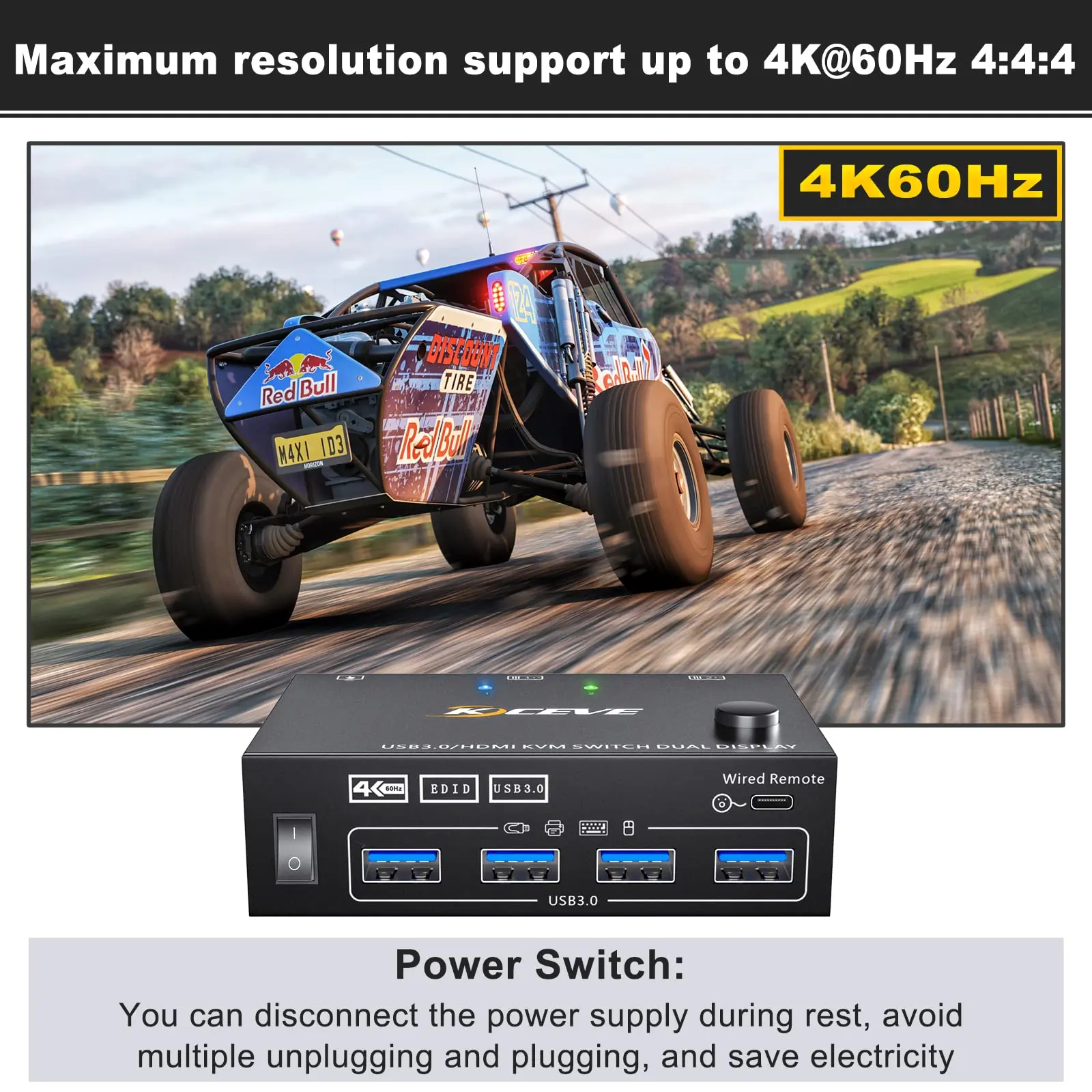 2.Ultra HD 4K@60Hz :USB 3.0 Dual Monitor KVM switch HDMI support resolution 4K@60Hz,[email protected] switch 2 monitors 2 computers aslo support input terminal to connect 2 computers with different resolutions, e.g. one is 4K@60Hz, the other is 4K@30Hz, 1440P@60Hz, 3D,1080P@60Hz or lower resolution.Note: if you need a 4K resolution , please use HDMI 2.0 cable and make sure your computers and monitors support 4K !