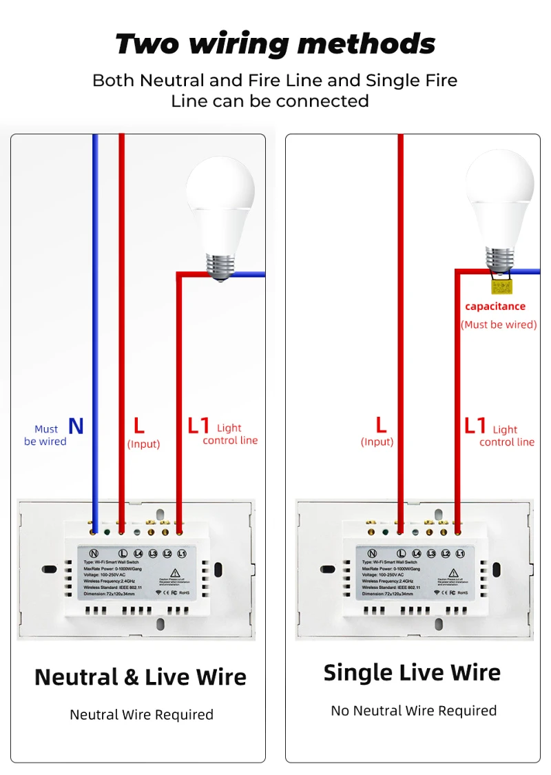 【DOS métodos de cableado】 Admite sistema neutro y sin sistema neutro. Admite Sistema de fuego único, pero necesita un condensador cuando no utiliza sistema neutro. (el condensador está incluido).