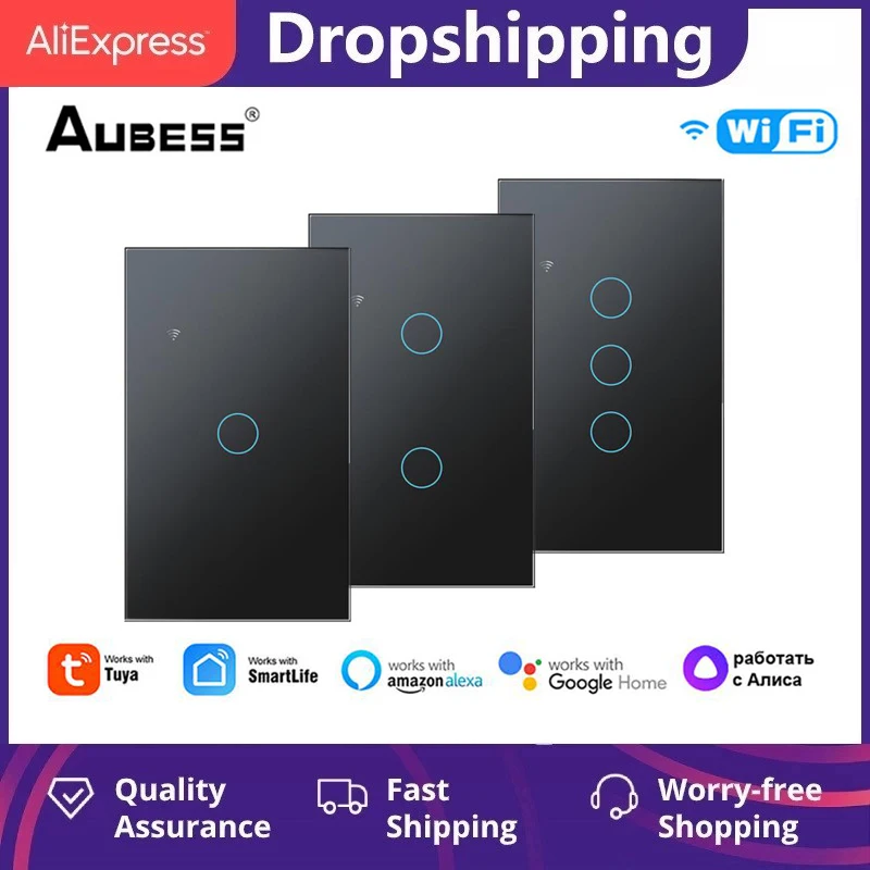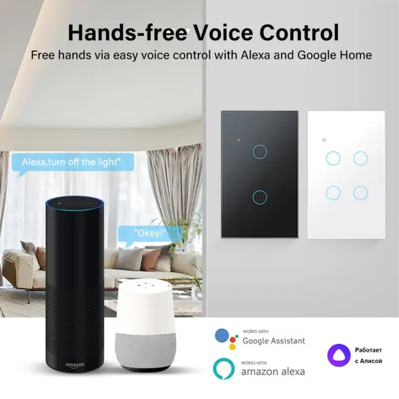 Comprar Interruptor de luz táctil inteligente, dispositivo con WiFi, RF, EE. UU., 1/2/3/4 entradas, dos métodos de cableado, Tuya, Smart Life, Control a través de Alexa, Google Home, Yandex, Alice