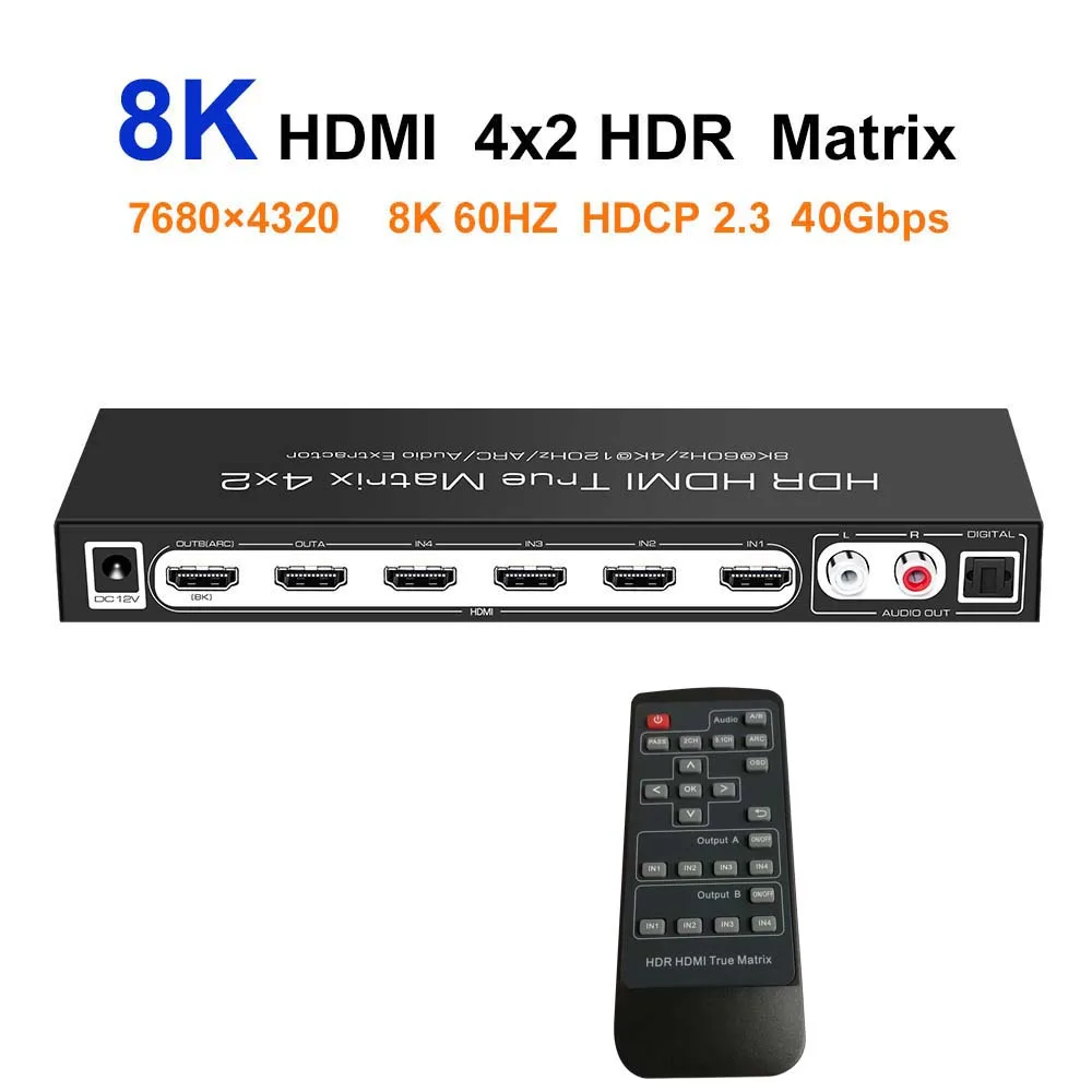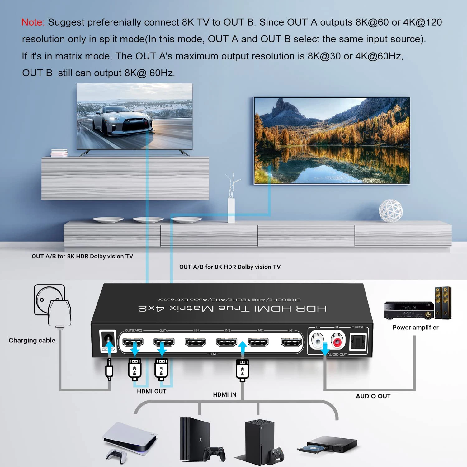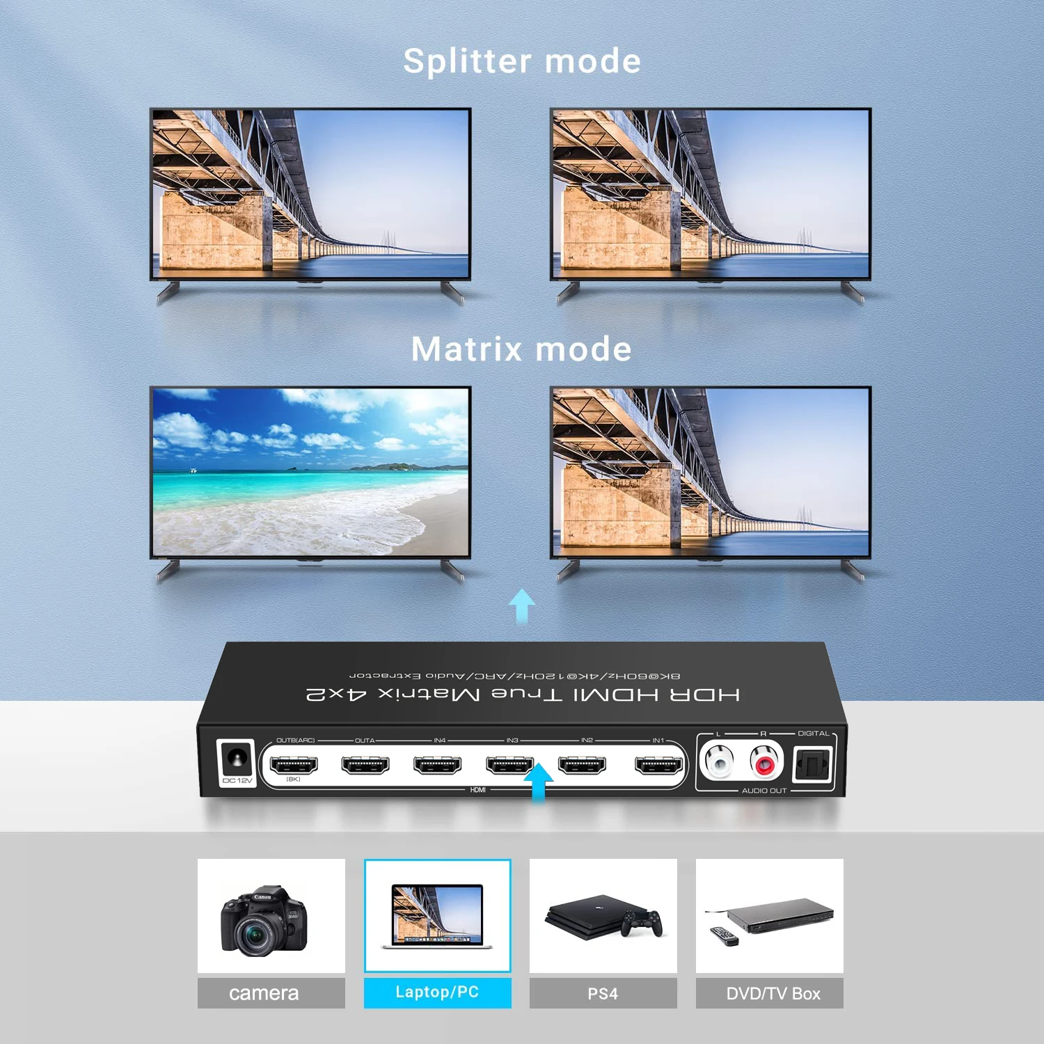 Comprar Interruptor de matriz HDMI 8K, divisor HDMI 4 en 2, salida HDMI2.1, 4k120Hz, ARC HDR10 + VRR ALLM Dolby Vision OSD SPDIF 5,1 LR 2CH para PS5
