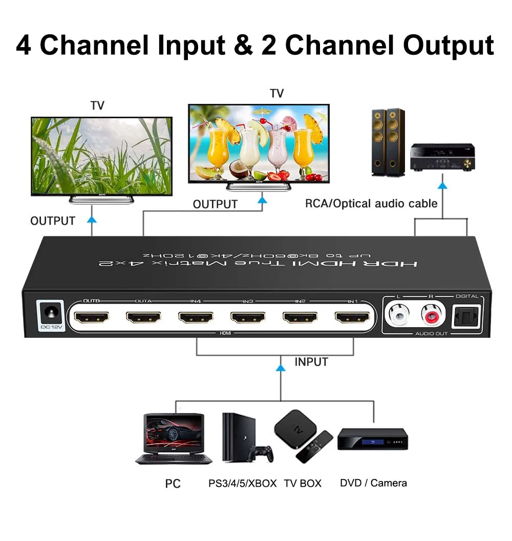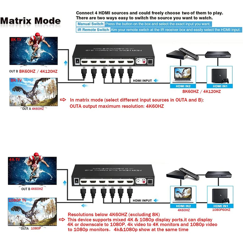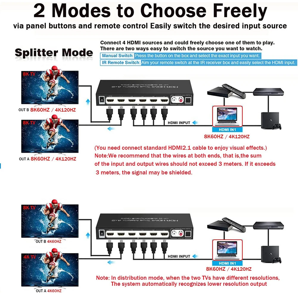Comprar Interruptor de matriz HDMI 8K, divisor HDMI 4 en 2, salida HDMI2.1, 4k120Hz, ARC HDR10 + VRR ALLM Dolby Vision OSD SPDIF 5,1 LR 2CH para PS5