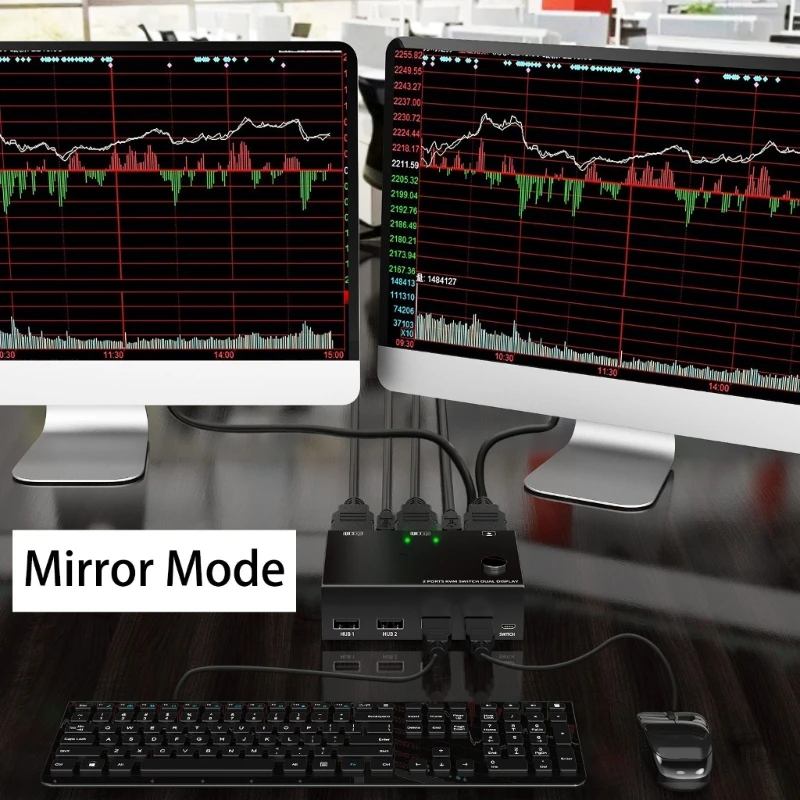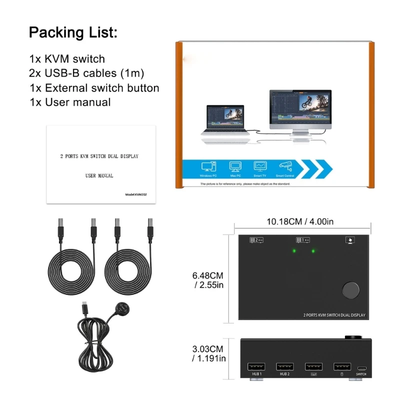 Características:Este es un interruptor de monitor dual KVM que puede controlar hasta 2 ordenadores u ordenadores portátiles con 1 juego independiente de teclado USB, ratón y monitor o 2 monitores de pantalla extendida o duplicada con entrada de enchufe dual.