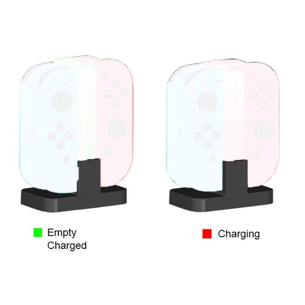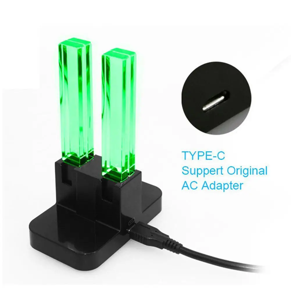 1.5.Cuando la batería incorporada para el controlador Switch está completamente cargada, la luz roja de la columna cuadrada transparente en la base de carga se convierte en verde esmeralda y permanece encendida.