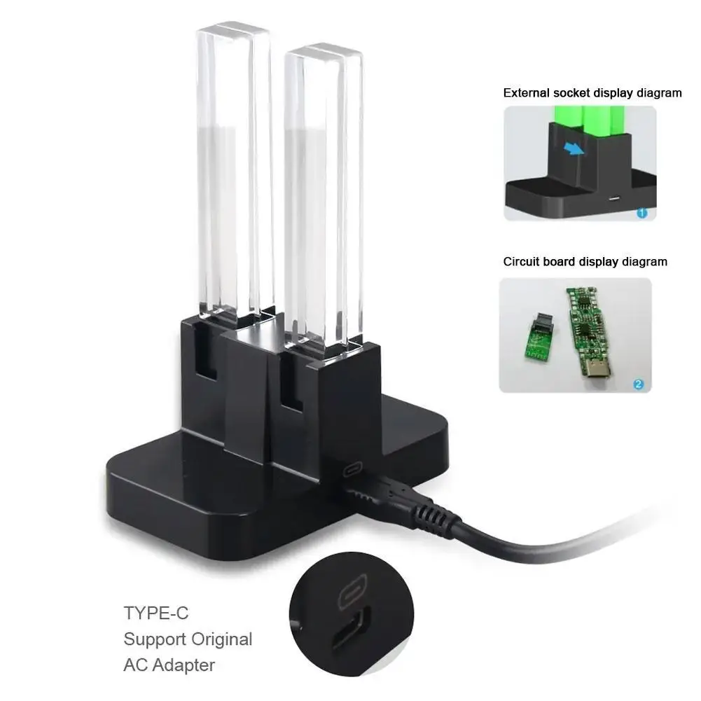 1.4.En consecuencia, insértelo el controlador Switch en los lados izquierdo y derecho de esta base de carga, como se muestra en la imagen.En este momento, si la luz verde esmeralda de la columna cuadrada transparente se vuelve roja, significa que el controlador Switch que cuelga de este puerto se está cargando.