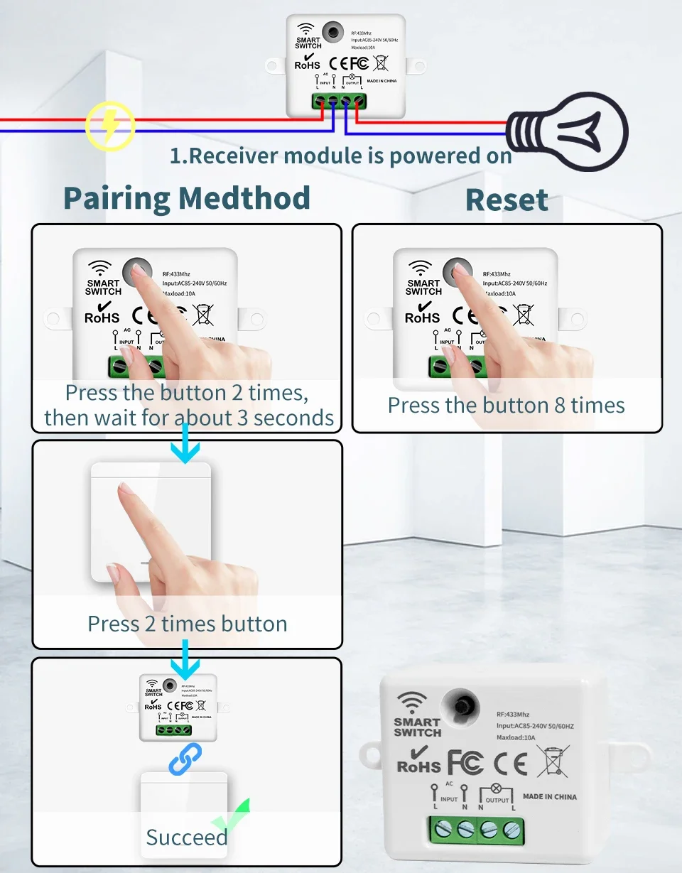Solo un paso: Presione el botón de aprendizaje (en el receptor) 8 veces. Espere 3 segundos;