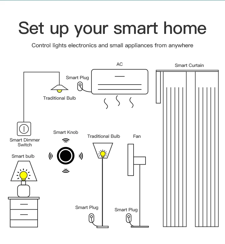 5. Cree múltiples escenas inteligentes para dispositivos inteligentes Tuya en la aplicación en modo escenario: para crear cualquier automatización inteligente que desee en la aplicación de su teléfono inteligente para comenzar su otro estilo de vida inteligente, no más Se necesita un comando de voz, no más tiempo para abrir su aplicación, solo se requiere una operación simple para activar las escenas que ha configurado, cuando está cansado de un día de trabajo, como el modo de inicio, modo de ducha o modo de suspensión.