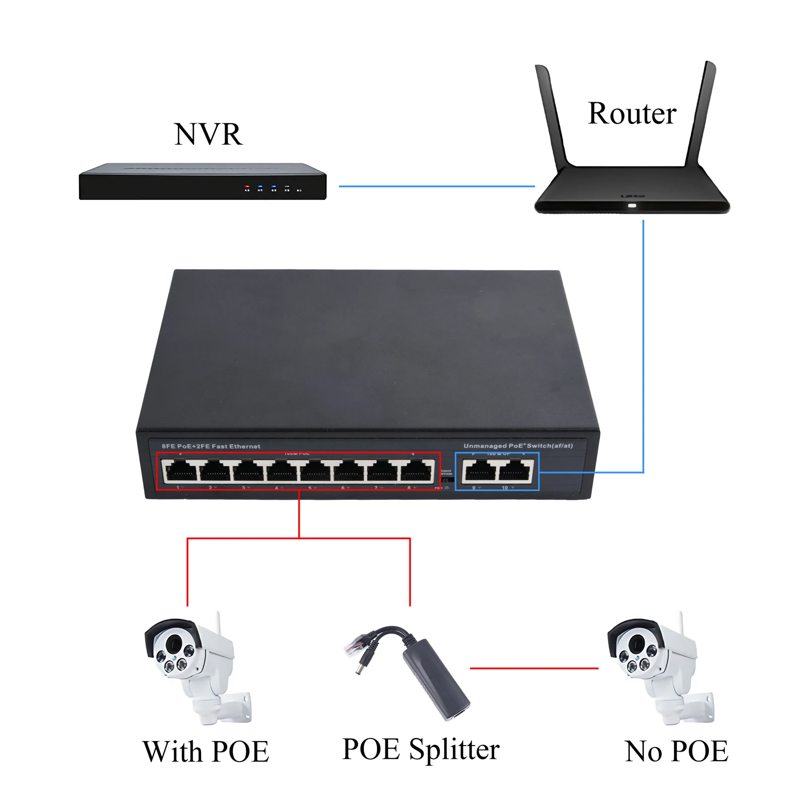Comprar Interruptor POE estándar de 1 piezas, interruptor Ethernet de 10/100Mbps, 8 puertos + 2 puertos de enlace ascendente, protección contra rayos para cámara IP, AP inalámbrico