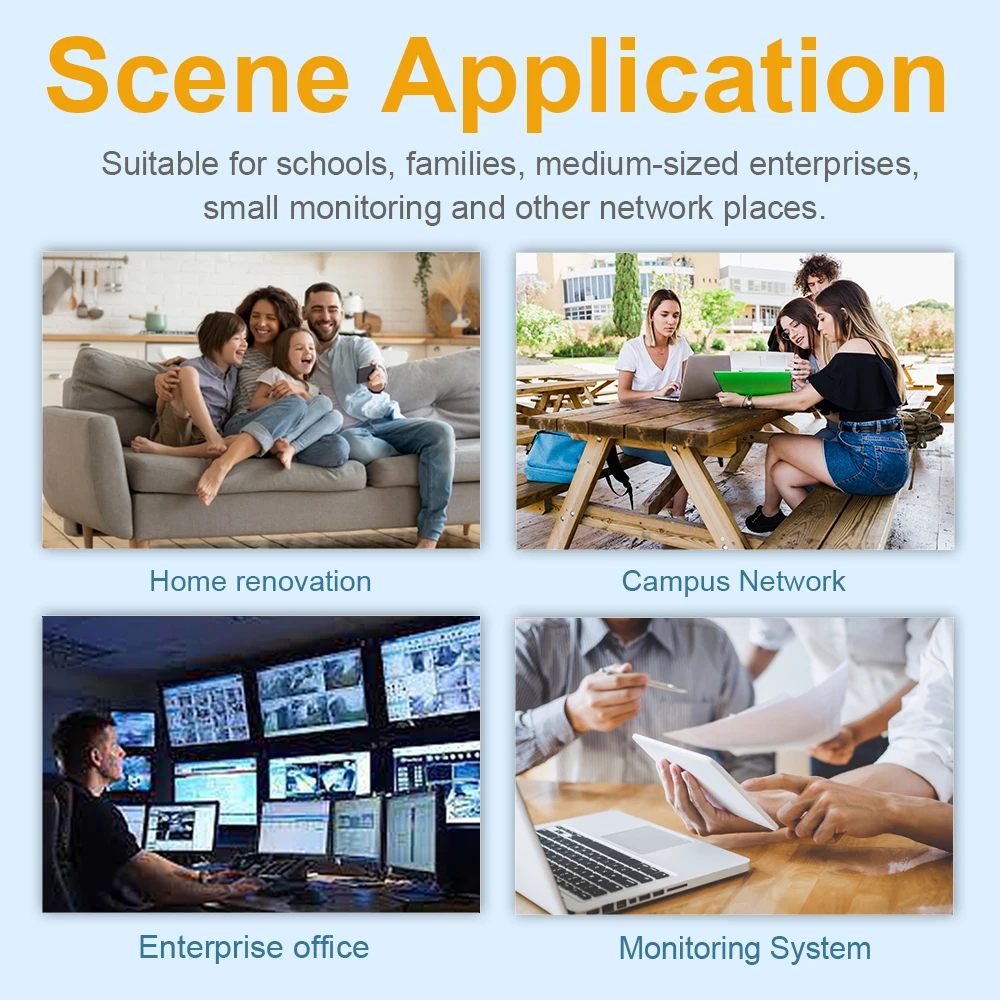 El interruptor adopta un diseño de circuito altamente integrado para optimizar de manera integral el rendimiento del producto, cumplir con los servicios básicos de acceso de fibra óptica y garantizar una transmisión de datos eficiente y estable. Es una opción ideal para mejorar la experiencia en línea de hogares y empresas. Ver películas de alta definición y jugar juegos en línea a gran escala lo hace más fluido y rápido.