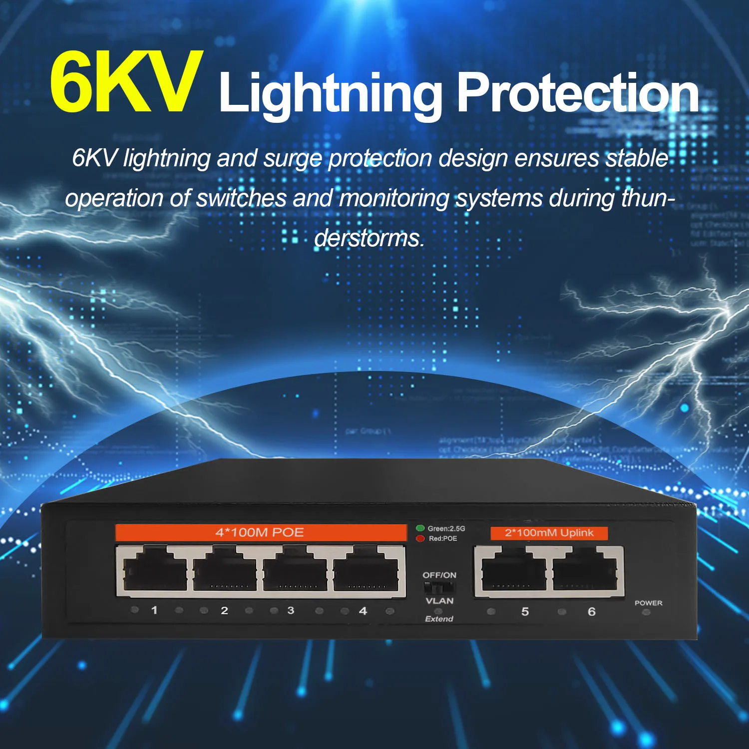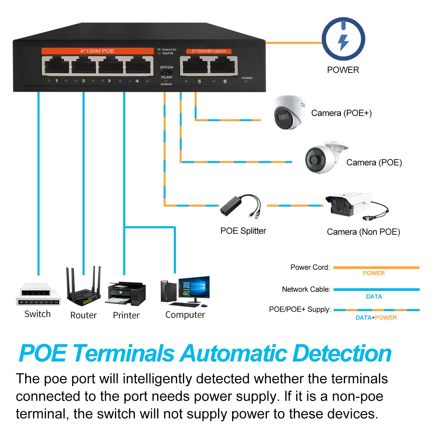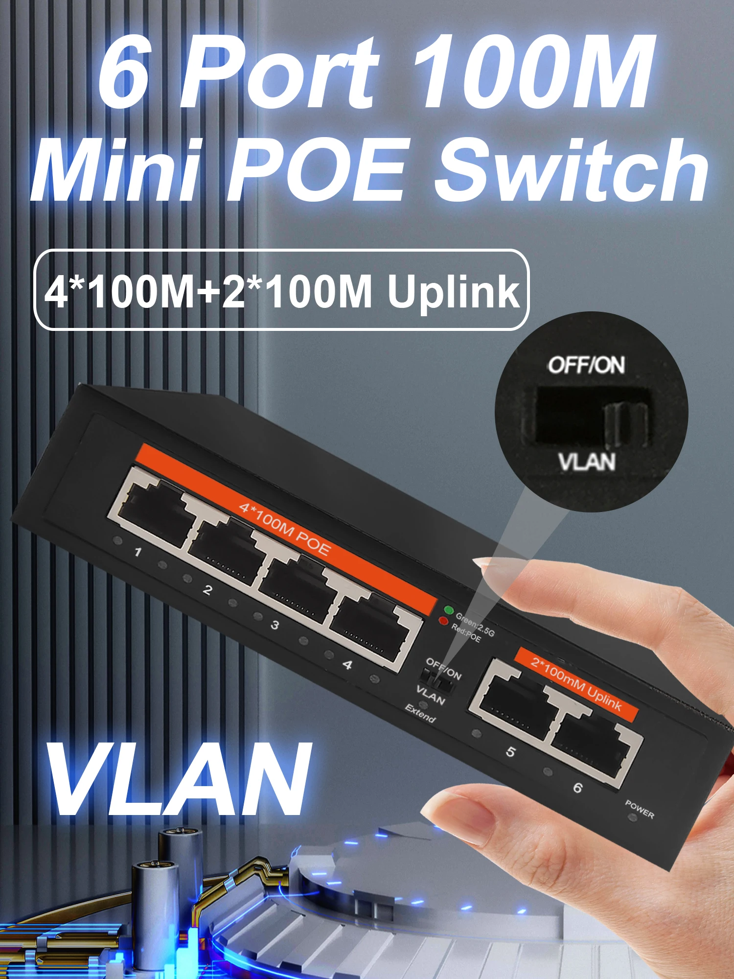 Interruptor de red Ethernet POE de 100Mbps, conmutador no gestionado de 65W, 4 puertos POE + 2 puertos RJ45, IEEE 802,3 af/at VLAN para enrutador Wifi/cámara/AP inalámbrico