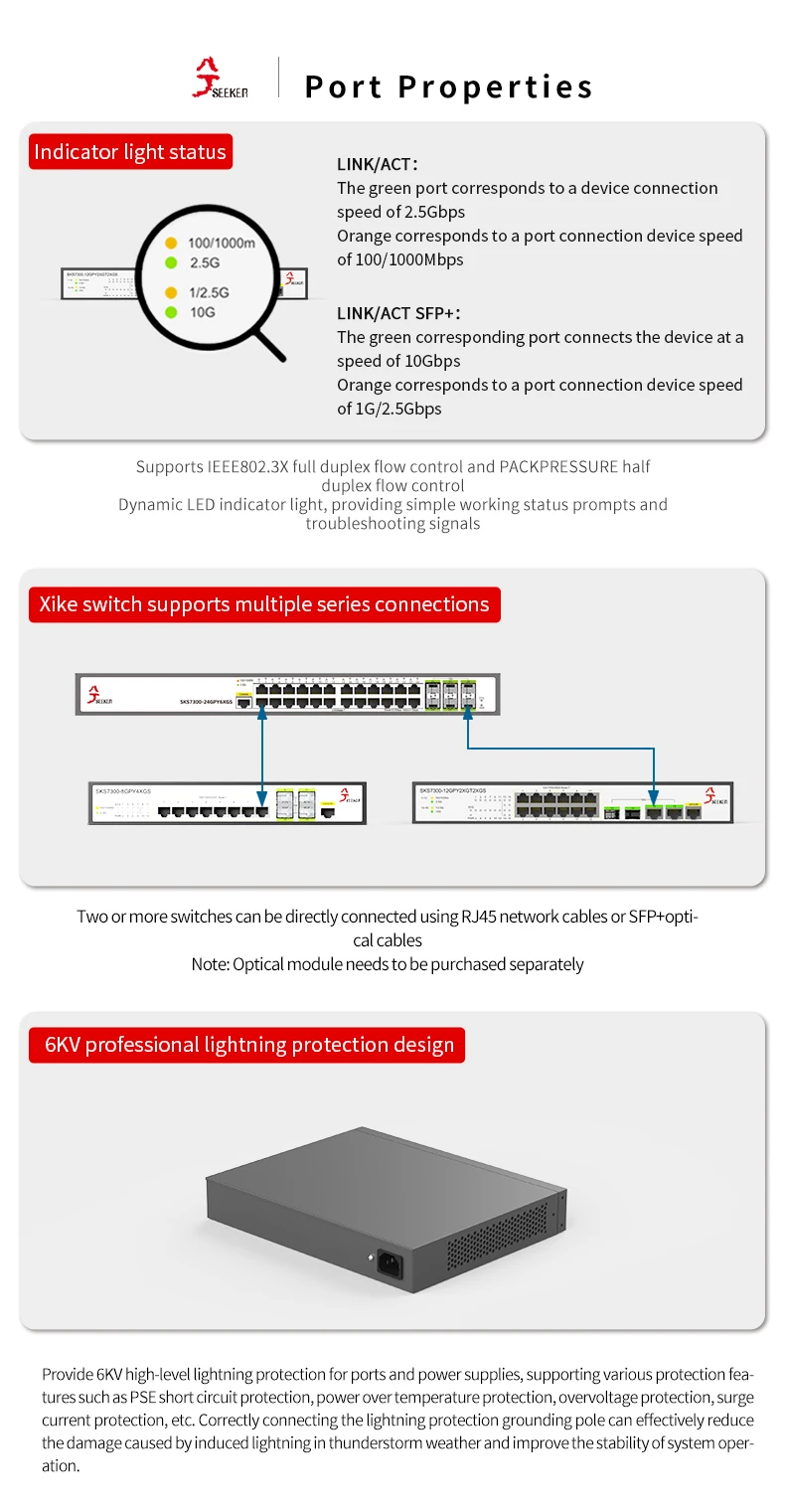 División de VLAN, agregación de enlaces, gestión de banda ancha QoS, configuración de bucle, duplicación de puertos, aislamiento de puertos, configuración de tramas Jumbo, etc.