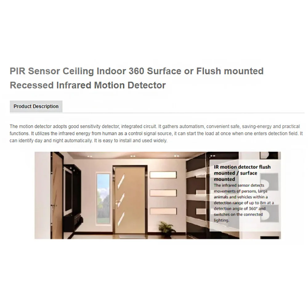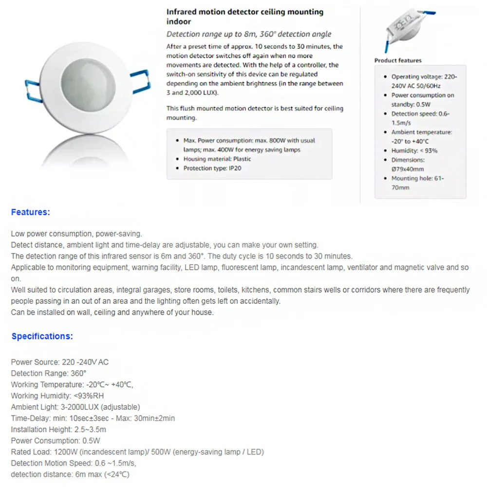 3.El rango de detección de este sensor de infrarrojos es de 6 metros y 360 metros.El ciclo de trabajo es de 10 segundos a 30 minutos con lámpara incandescente y válvula solenoide, etc.